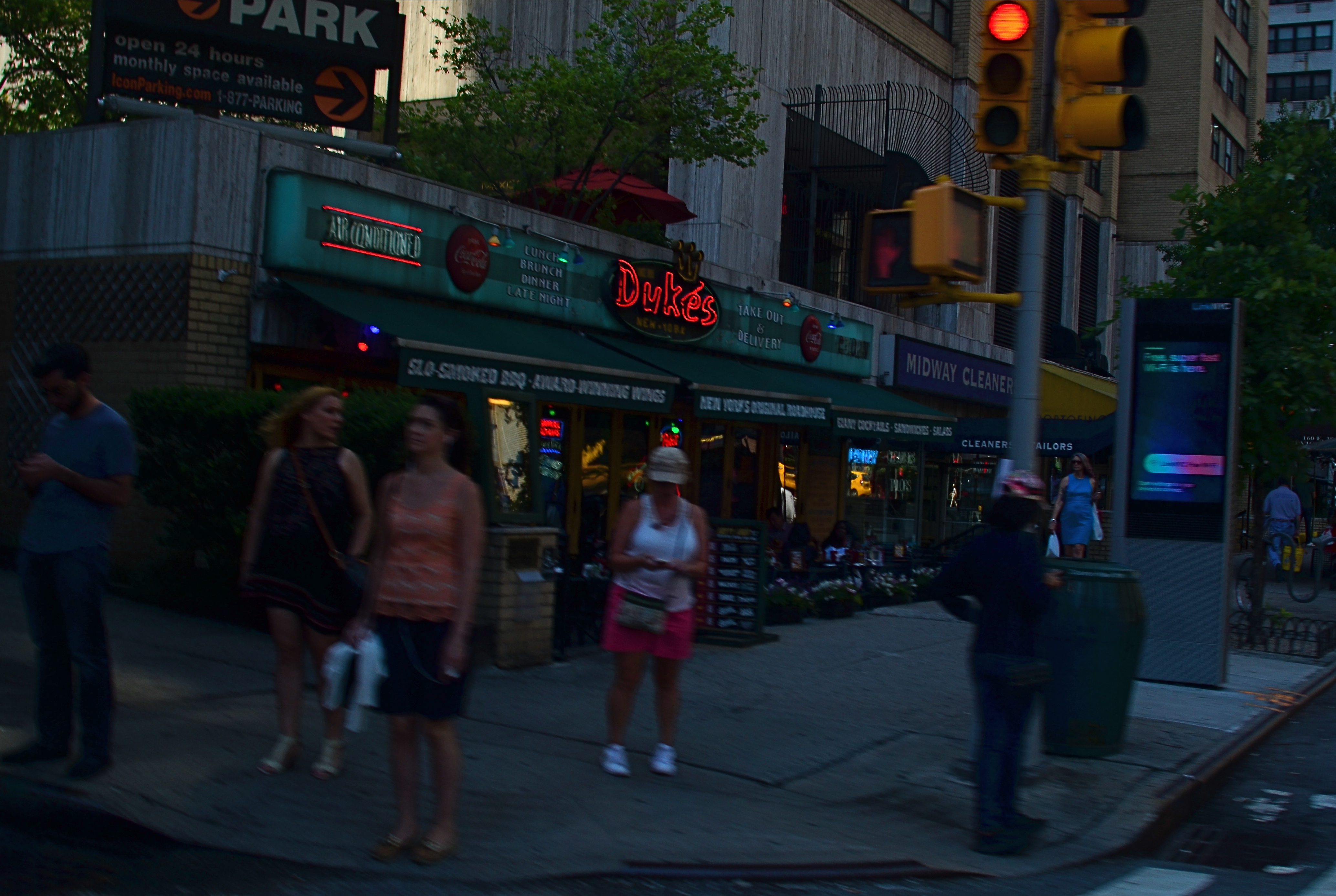 I struggle with these choices whenever I produce a shot that has things “wrong” with it, but which is also an authentic register of where my mind was at the time it was snapped. Photos like the one seen here would fail many a judge’s test, depending on who’s doing the judging. It’s too dark. The shutter speed is way too slow, inviting blur. Some of the shadows swallow detail that might just be important. And yet I love this building, these people, this moment. In my defense, I had to decide in an instant whether to even attempt the picture, taken, as it was, from the back seat of an Uber lurching unevenly through the streets of Manhattan. Shooting on full manual, I had to anticipate fast changes in available light, the length of traffic signals, the process of shooting through glass with a filtered lens, and the occasional offensive/defensive maneuvers of the driver. In raw scoring, I just didn’t manage to master all of these variables in a technically perfect manner. And yet..