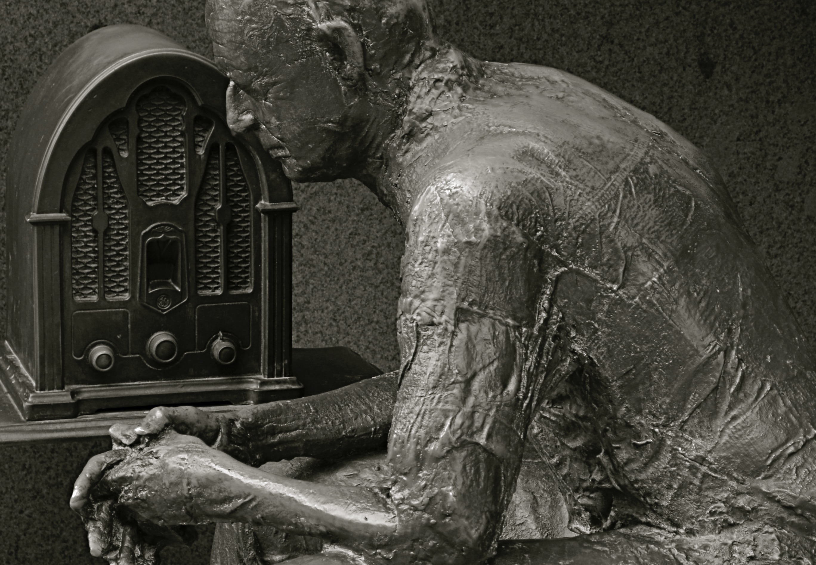 There are four open-air “rooms” in the FDR Memorial in Washington, D.C., each designed to symbolize one of the separate presidential terms of Franklin Roosevelt, along with references to the specific challenges of those four eras-within-an-era. One such room houses sculptural reminders of how the average person interacted with the White House as it faced the singular challenges of the Great Depression. The figures, by George Segal (1924-2000), are spare, gaunt, haunting. One tableau shows an emaciated farming couple standing with grim determination amidst reminders of the Dust Bowl. Another shows a string of ragged men waiting in line for bread. My favorite figure shows a seated man leaning forward on his knees, his eyes fixed on the small “cathedral” radio set located just inches away. The sculpture is more than a mere tribute to Roosevelt’s encouraging series of “fireside chat” broadcasts, which acted to bolster the frightened nation as banks failed and privation swept across America like a plague of locusts. It is a snapshot of the relationship between leaders and the led. A bond. A lifeline of trust.