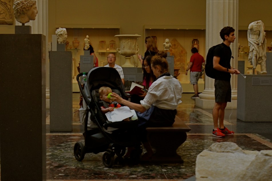 The sculpture gallery shown here, one of the most beautiful rooms in Manhattan’s Metropolitan Museum of Art, is certainly “picturesque”enough all by itself. However when the room is used to frame the chessboard-like weaving of live humans into the pattern of sculpted figures, it can create its own unique visual choreography, including the mother who would love to bottle-bribe her baby long enough to finish just one more chapter.