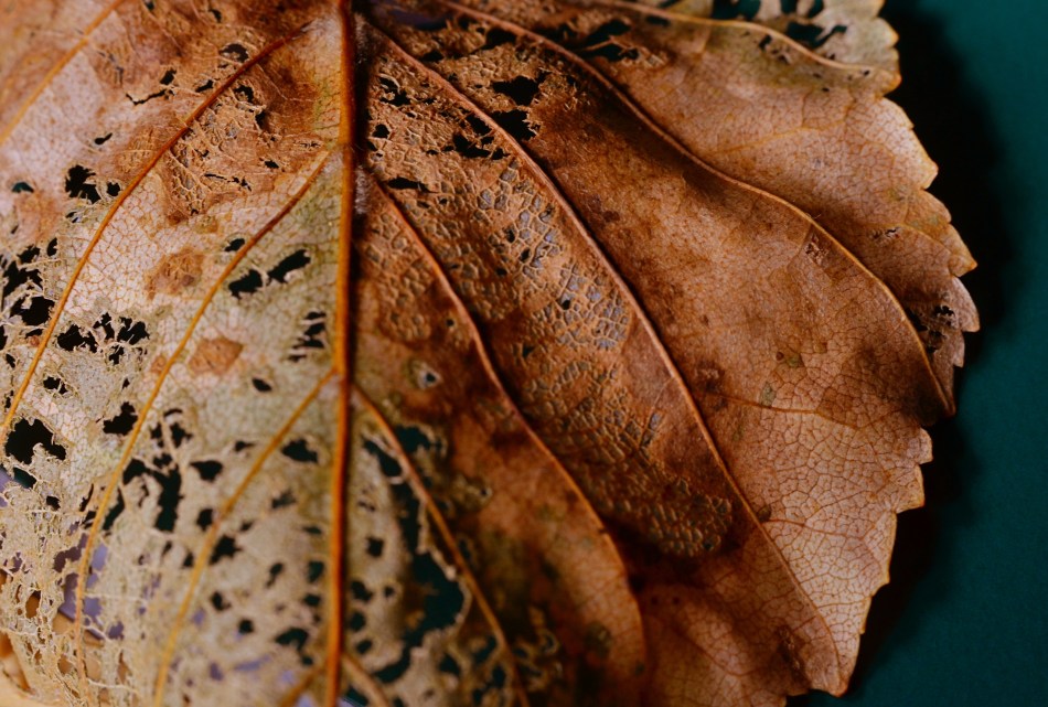 In one such instance, people see me staring at leaves. Dead or dying leaves. Wet ones. Half rotted ones. Leaves that are placed first on this side, then on that one, then directly in light, then cloaked in shadow. My interest in them isn’t botanical, since I often know next to nothing of the objects I’m photographing (not scientifically, anyway), and so I can’t even invent some great story about why I have chosen one over the other. They are just abstract texture to me, texture that almost always varies wildly from leaf to leaf. If I see anything symbolic at all in them, I probably see the human hand, specifically the aging human hand. In recent years I’ve taken a number of images of my ninety-year-old father’s hands, which are, at this point in his life, almost as telling about his history as the lines on his face. In turn, I began to study my own hands, which are twenty-three years behind his, but well on the path toward “wizened” status. It was at some point that leaves, which sport their own age spots, wrinkles, scars and discolorations, starting to talk a bit louder to me.