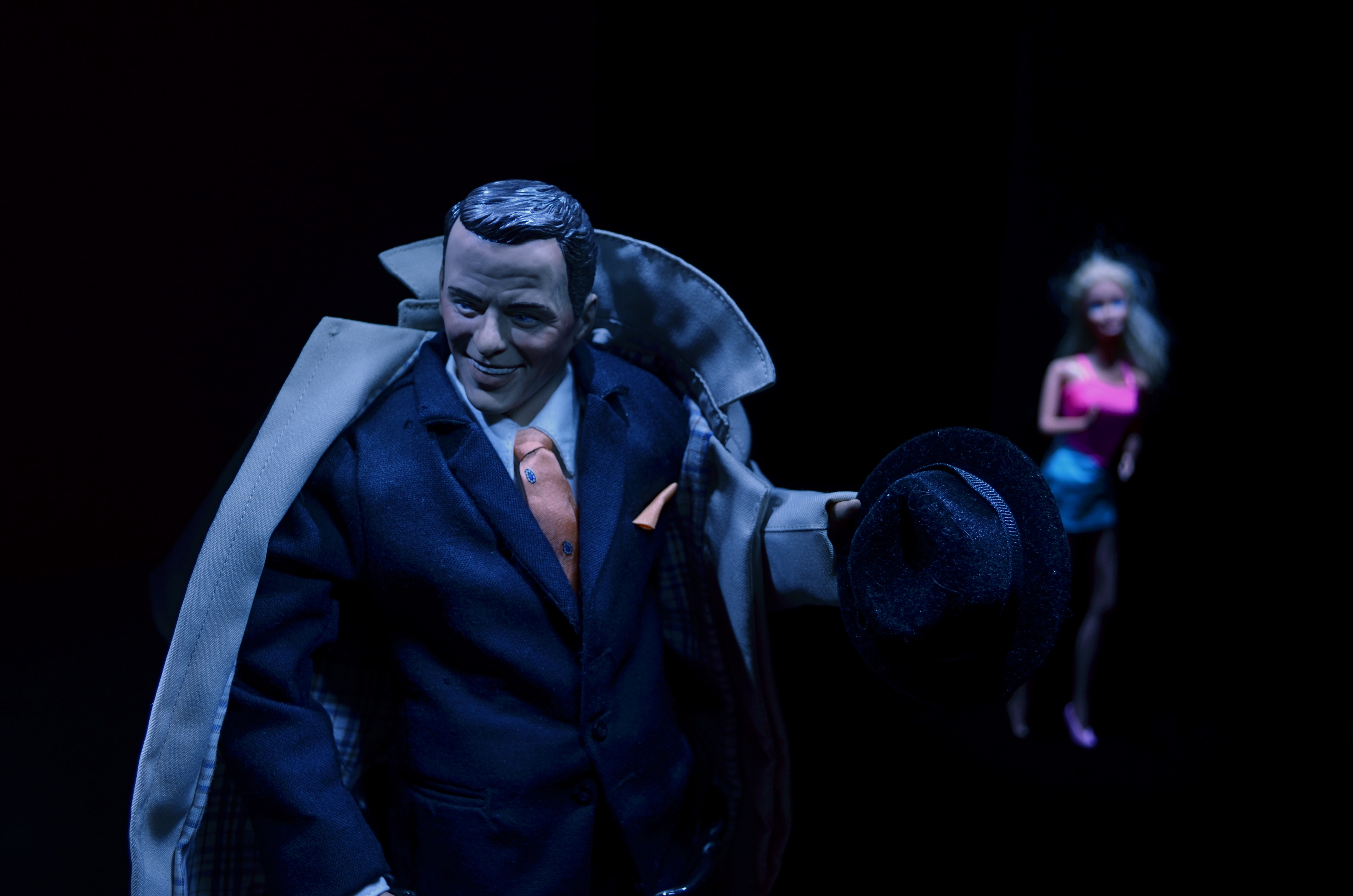 For the above image, I rescued two old dolls from the ash can for one more chance at fame. A friend who knew I was a lifelong Sinatra fan gifted me years ago with a beautifully detailed figure of Ol’ Blue Eyes in his trademark fedora and trench coat, the perfect get-up for hanging out underneath lonely, dim streetlights after all the bars have closed. The other figure is of course a Barbie, left behind when my stepdaughter headed off for college. Normally, these two characters wouldn’t exist in the same universe, and that was what struck me as fun to fool around with. I started to see Barbs as just one of a series of romantic conquests by The Voice on his way through the Universe of Total Coolness, with the inevitable bust-up happening on a dark street in the wee small hours of the morning.