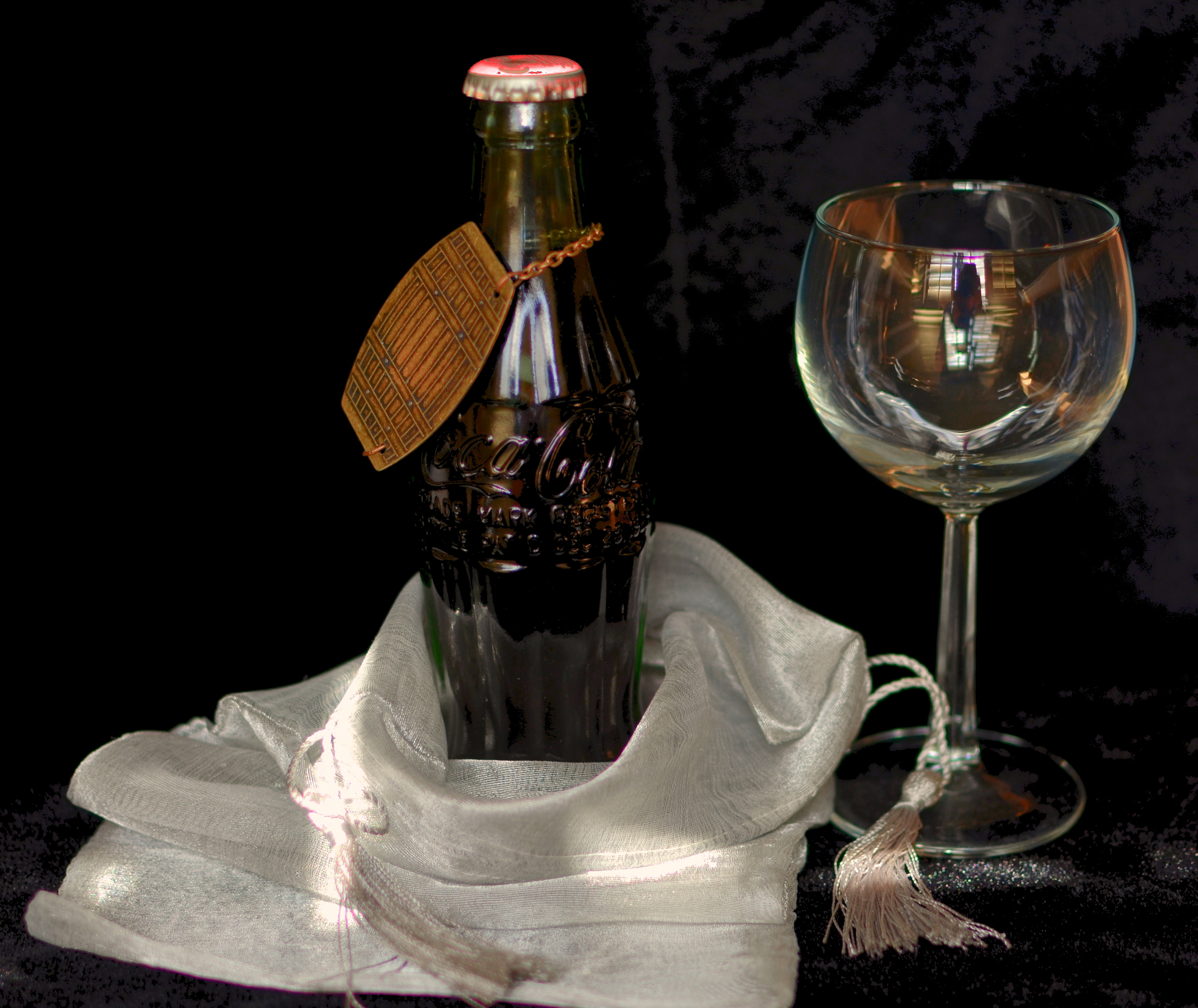 Some small glass bottles of Coke will continue to be sold at retail going forward, but their graphics are painted on, rather than molded into the glass. Call me a purist, but, as a fan of tabletop still lifes, I thought it was high time the original hand-sized, green glass, America-won-the-war Coca-Cola bottle posed for its closeup. I decided to add a little pomp by way of props to suggest Everyman’s Drink as a fine vintage, but, hey, we all know damn well that we never, ever had a glass of wine that came close to the first burpy sting of a cold swig of The Real Thing.