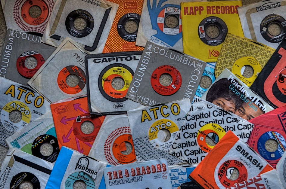 Ordinary things are no longer ordinary once they are removed from daily use. Their context is lost and we are free to judge them as we cannot when they are part of the invisible fabric of daily habit. For example, how ordinary are those old piles of 45-rpm records on which we no longer drop a needle? Several revolutions in sound later, they no longer provide the same aural buzz they once did, and yet they still offer something special in the visual sense. The bright colors and bold designs that the record labels used to grab the attention of music-crazed teenagers in the youth-heavy ’60’s are now vanished in a world that first made all “records” into bland silver-colored CDs and then abolished the physical form of the record altogether. They are little billboards for the companies that packaged up our favorite hits; there is no “art” message on most of the sleeves, as there would have been on album covers. They are pure, unsentimental marketing, but the discs they contain are now a chronicle of who we were and what we thought was important, purchases which now, at the remove of half a century, allow us to make a picture, to interpret or re-learn something we once gave no thought to at all.