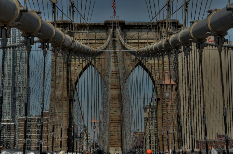 After more than a century over the East River, John and Washington Roebling’s pioneering span, the first steel cable suspension bridge in the world, shows its wear and tear as a proud trophy of its constant service. The delicate and yet sinewy cables, amazingly strong interwoven strands of what Roebling manufactured under the name “steel rope”, are the most amazing design elements in the bridge, presenting an infinite number of kaleidoscopic web patterns depending on when and where you look.