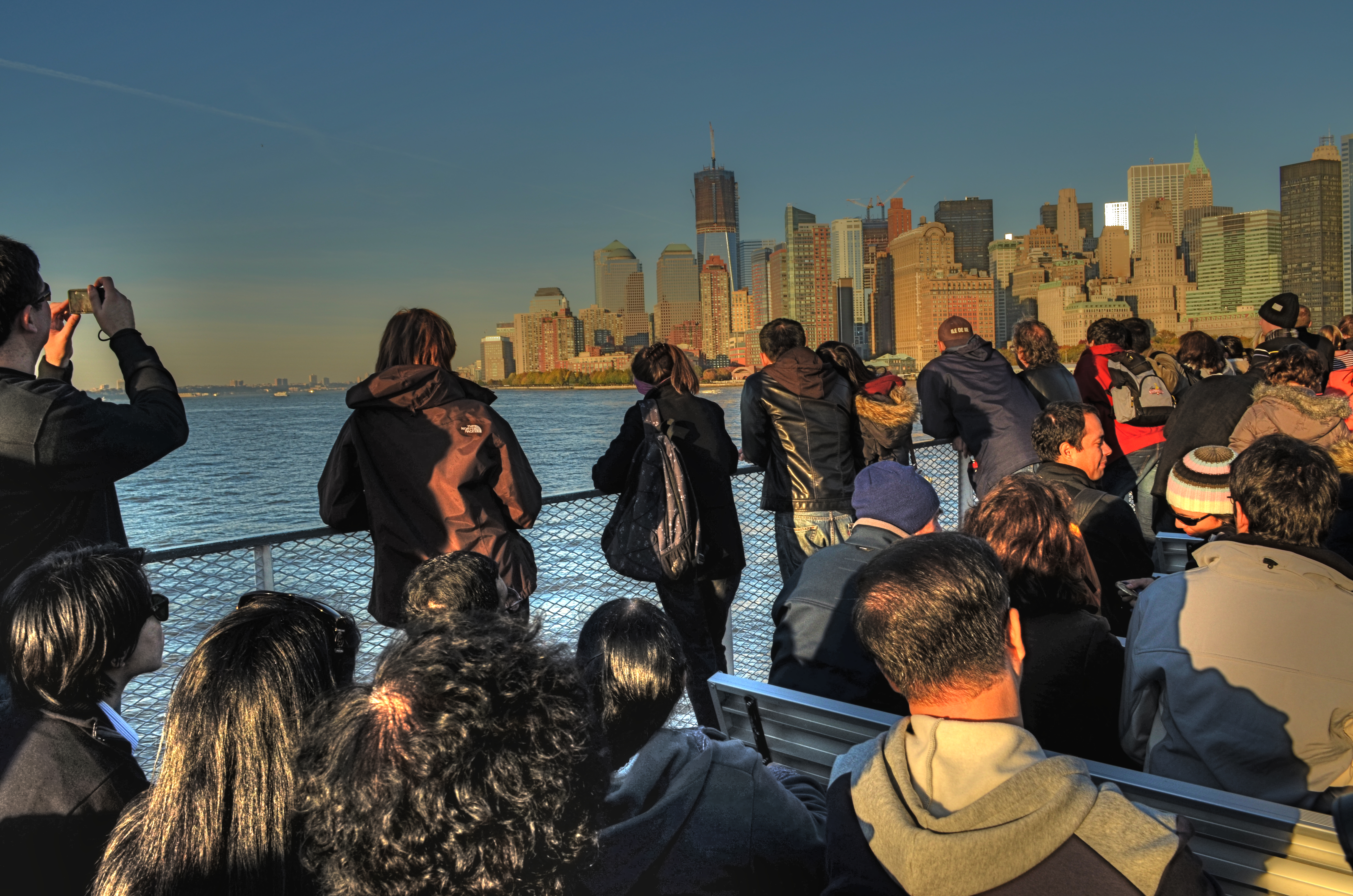 Returning from Liberty Island and Ellis Island in November 2011, a packed tour boat’s passengers crowd the rail for a view of WTC 1, rising as the new king of the New York skyline.