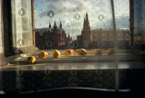 Always, a human context. Sam Abell capture of the iconic buildings of the Kremlin, framed by ripening fruit and lace curtains.