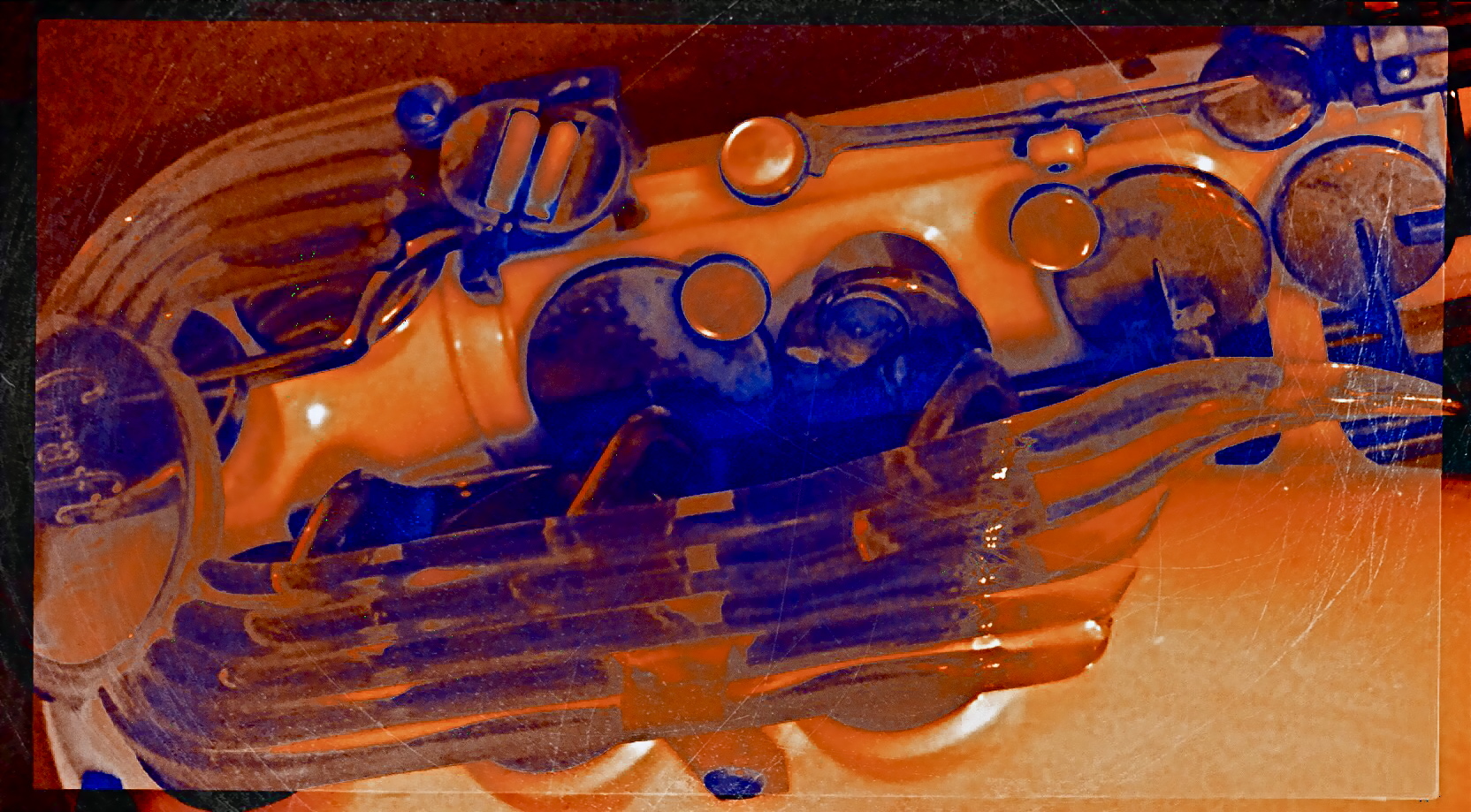 The object at the top of the page, a rare injection-molded plastic saxophone from the 1940’s, had already been “abstracted” by its designer, since we all have a traditional way of visually “knowing” that instrument. That is, it’s supposed to be brass-colored metal, curve in such-and-such a fashion, and feature ornamentation of a set type. Prominently, the designer re-ordered the sax’s features… in plastic, with browns and purples arranged in a fluid, stylized flow of elements. That means, that, as a photographer, I begin with my own set of expectations for the object already substantially challenged. Further, in photographing it, I can rotate the sax, compose it in the frame in an alternate fashion, reassign or intensify its colors, or, as in the small insert(which is a composite of a color negative, a monochrome negative, and a color positive), even change the relationship between surface and shadow.