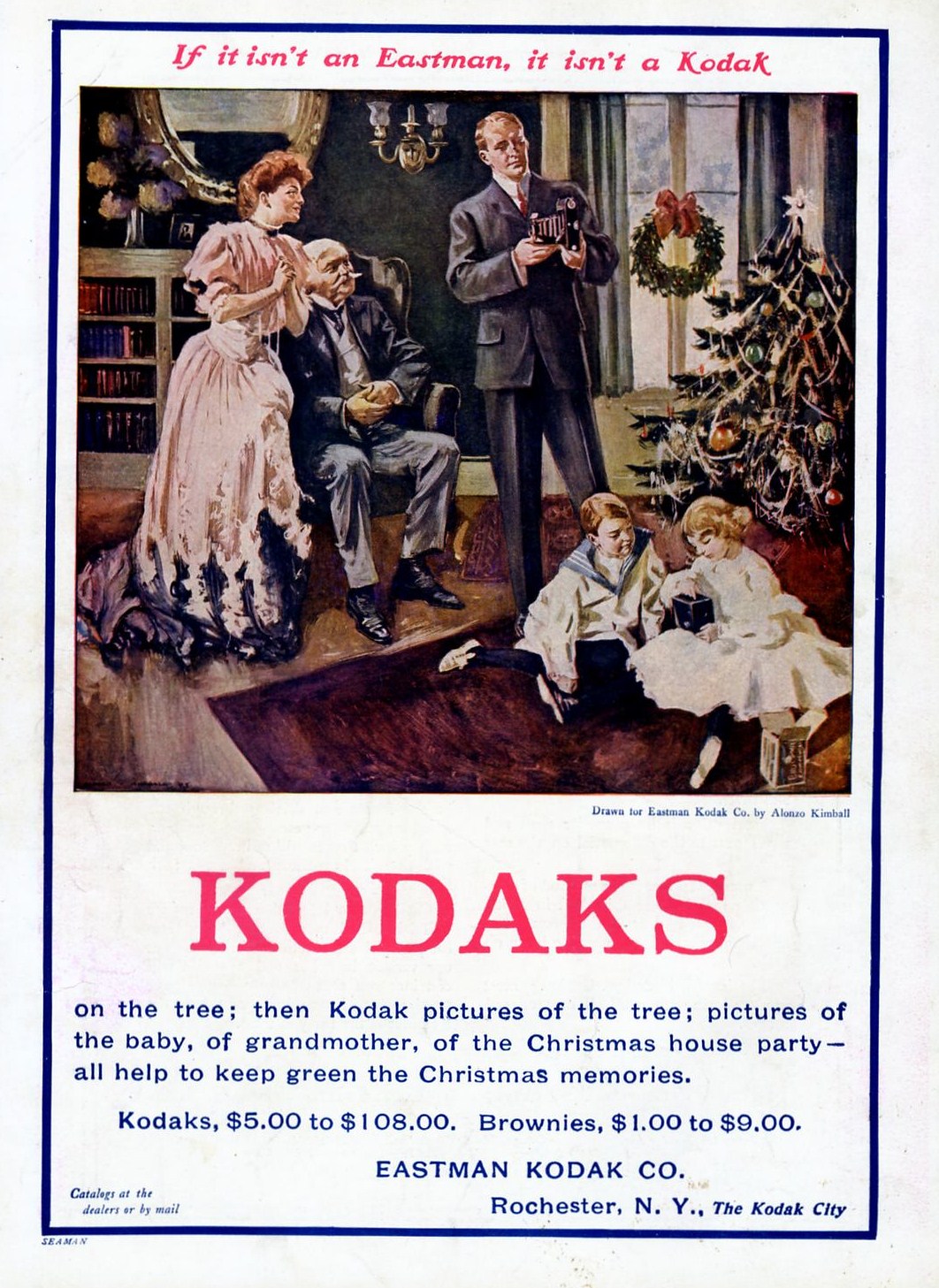 EASTMAN KODAK WAS THE FIRST COMPANY to truly democratize photography, taking it from a tinkerer’s hobby or the domain of the studio professional and placing it in the hands of the average consumer. A streamlined process for producing modestly-priced, easily operated cameras, as well as the introduction of roll film and standardized processing, made it possible for anyone to capture memories on a reasonable budget. To do this quickly, Kodak, well before 1900, also became one of the first and best early forces in the use of mass marketing. And one of the biggest pillars in the foundation of that effort was Christmas.