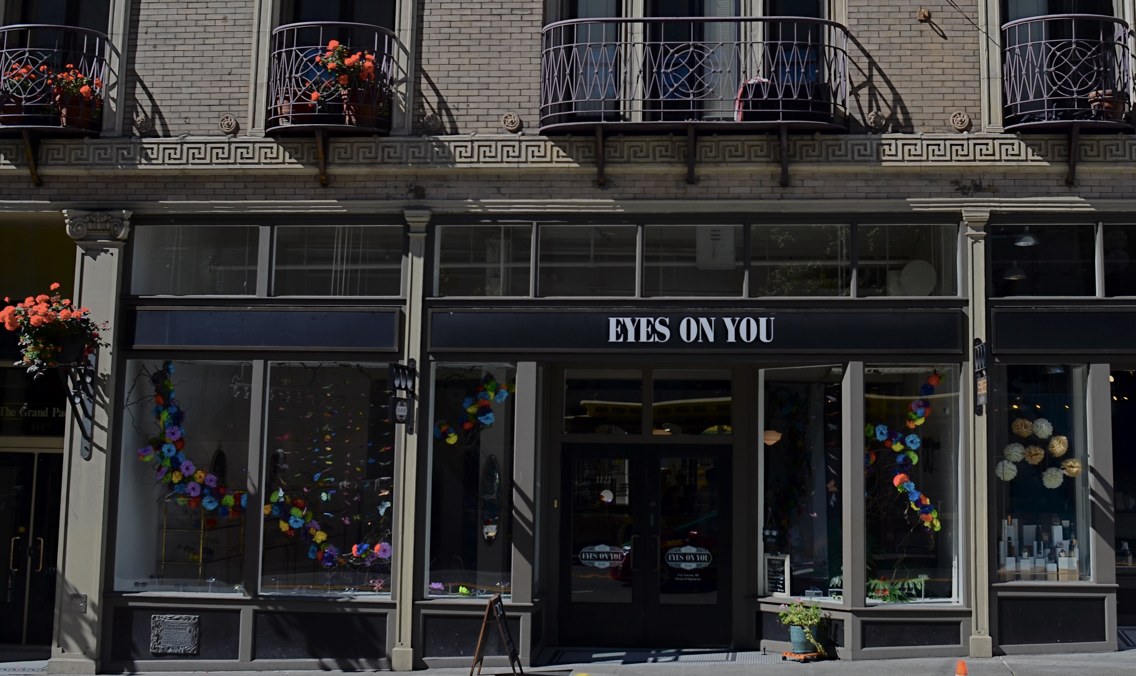 And there you have my quest in a nutshell. I love storefronts which boldly state that ground beef is going for $1.40 a pound or that “we repair any shoe”, but my absolute favorites are always the conundrums, the “exactly what is this place”-type businesses, where even a creatively decorated scheme is zero clue as to what is transpiring within….sort of like the shop seen here. And, yes, there are some tiny clues that Eyes On You is a place that sells glasses, as there are, indeed, a few of them just visible in a small niche in the right-hand windows. But what is all that other stuff? And what does it have to do with selling, well, anything? It doesn’t matter; half the fun, as the cruise lines used to say, is getting there, and decoding the marketing mysteries of small businesses is fun in the way that a brisk game of Twenty Questions can be. Photographs, as we often remind ourselves, both reveal and conceal….sometimes at the same time. Loving where and when that happens is the spice of the game.