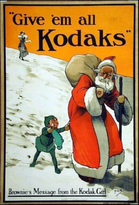 The Kodak Girl (n the distance) sends an urgent message to St. Nick on how to provide the perfect Christmas in this early 20th-century ad.