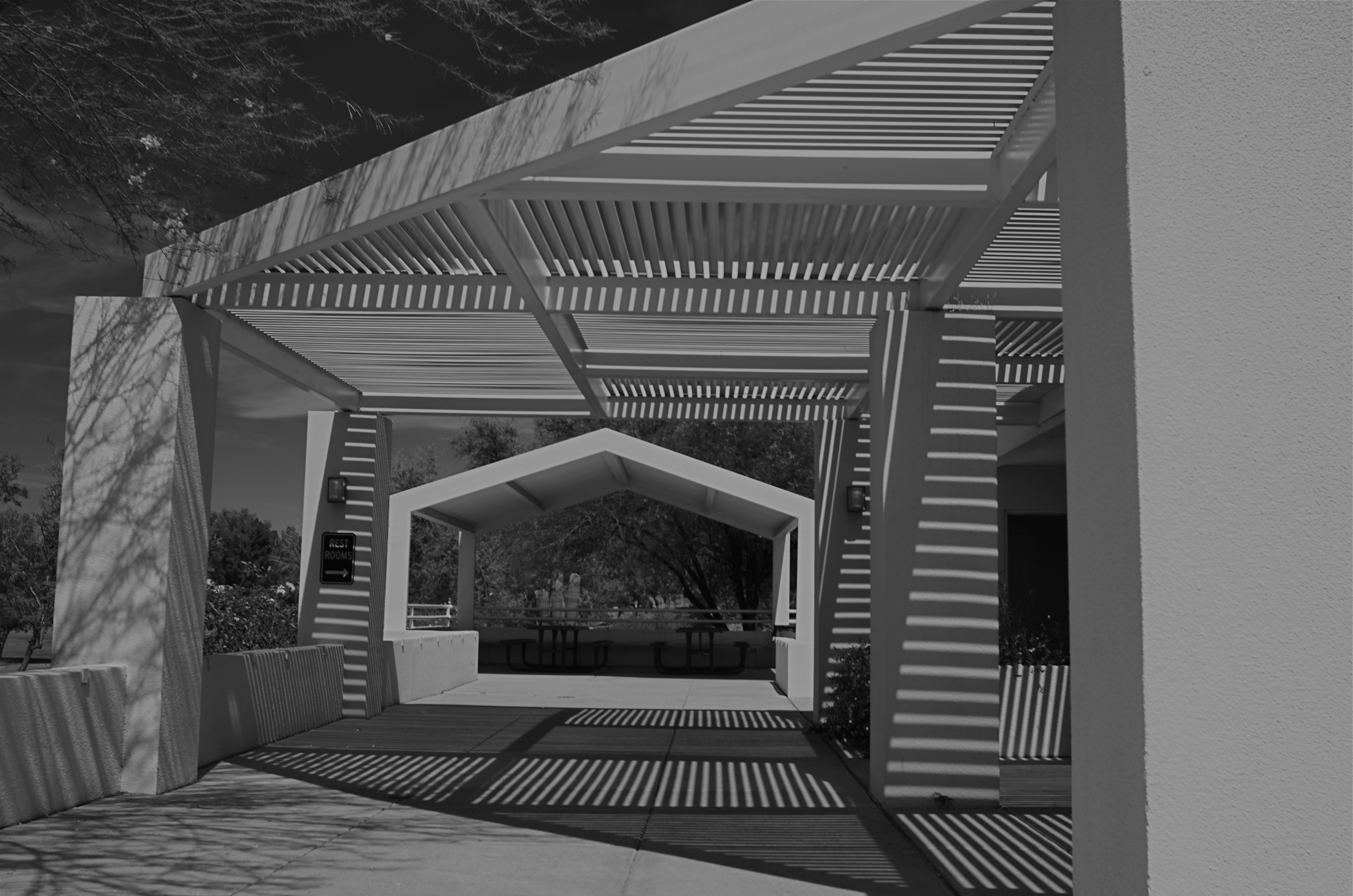 In a situation like the above pattern of shades and light shafts, color gives you brilliant blues and off-whites for the darks and lights, and a real hodge-podge of hues in all the crannies of the metal grids. However, rather than de-saturate the color to make b&w, I found it better to shoot the master image in black and white, using a red filter and a polarizer to maximize contrast, forcing all the dark and light shades into two hard-line general values. This forces the design to be the primary attention-getter, eliminating the distraction inherent in a full raft of colors. That is, if the deepening composition of gridwork is the main message of the photo, then it makes sense to get the color out of the way of that story and see if it helps.