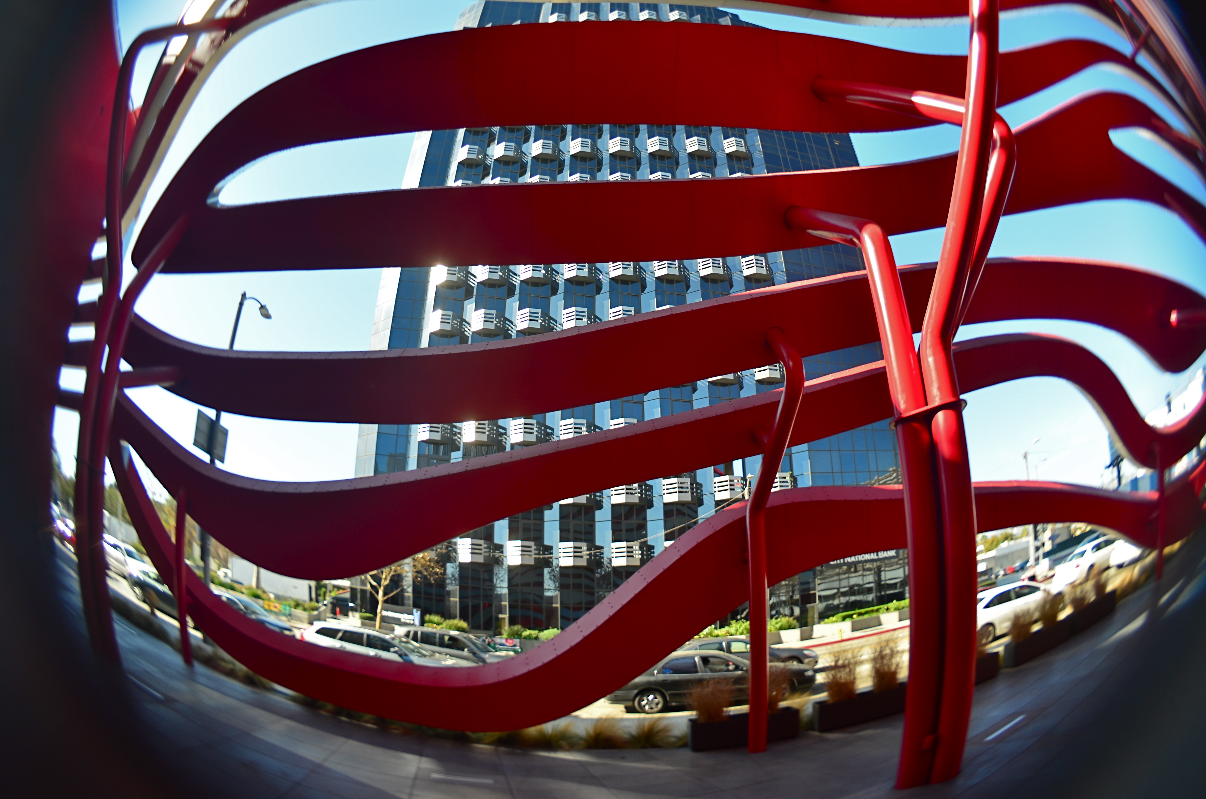 And, as it turns out, that’s the way to reverse-engineer a photo of the museum, since it’s possible to walk behind the swirly facade and into a shadow-and-color-saturated buffer space that exists between it and the underlying structure. From inside said space you can view the outer bands as a peekaboo grid through which you can view neighboring buildings and local traffic, rather like looking between the slats of some big psychedelic set of venetian blinds. And that’s where I stood when taking the above shot with a Lensbaby Composer Pro lens with a fisheye optic, the aperture set at about f/5.6 to render the whole thing somewhat soft and dreamy. I’ll see your two weirders and raise you one bizarre.