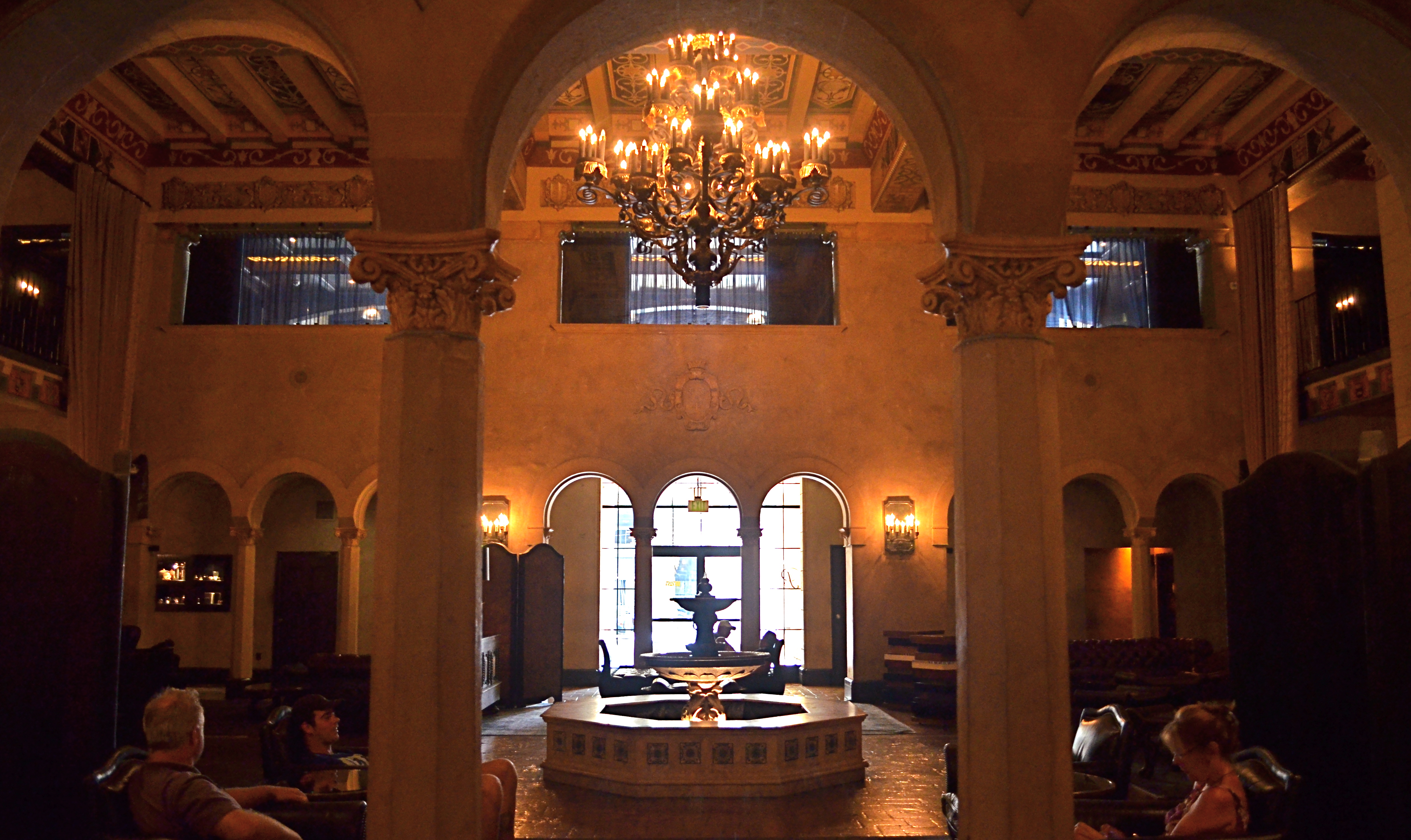 Over the decades the Roosevelt and its across-the-street neighbor the Chinese Theatre (which opened within months of the “R”‘s premiere) saw a fairly staid business district transformed into “Hollywood & Highland” (trade mark)…. Sucker Bait Central, a day-glo drag whose countless souvenir stops, IMAX pleasure palaces, low-rent novelties and neon knock-offs raised tackiness to the status of a religious movement. Meanwhile, the hotel’s crazy-quilt architectural style (‘Spanish Colonial Revival’…and, yes, there will be a test later), with its coffered ceilings, mid-century pool cabanas and wrought-iron chandeliers, was just fake-elegant enough to pass for average in a town renowned for its, er, flexible relationship with “class”. Rolling through the years with an occasional ownership transfer and the odd walk-on in movies like Beverly Hills Cop II and Catch Me If You Can, the Roosevelt has recently offered lodging as a contest prize on ABC’s Jimmy Kimmel Live!, and landed landmark status as Los Angeles Historic-Cultural Monument #545.
