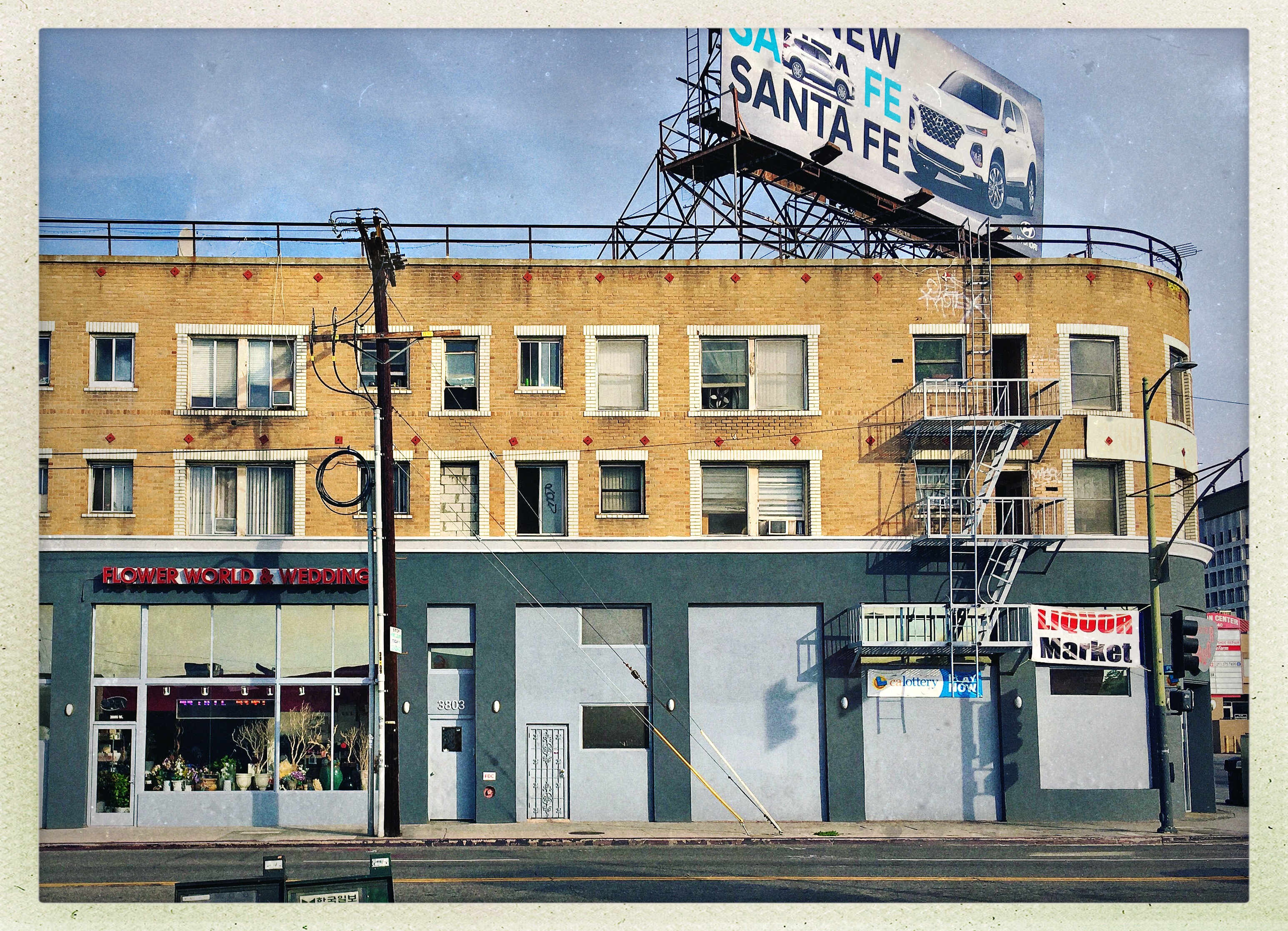 This image shows a typical block in Los Angeles’ Koreatown district, with residential, retail and undefined space co-existing in a single building, following the general rule for the neighborhood that everything should be re-purposed and then re-re-purposed pretty much forever. Things get old. Things break. Ownerships and administrations change. Priorities shift. Some parts of buildings disappear, others are re-imagined, still others are absorbed into other visions.