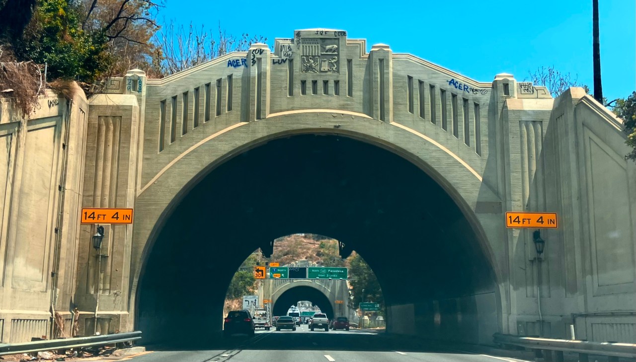 The first major highway linkages between downtown Los Angeles and nearby Pasadena were hard-won affairs, as the rugged hills of Elysian Park blocked the city’s Figueroa Street from direct entry to the smaller town, forcing north-south traffic to cross a bridge over the Los Angeles river, creating huge daily bottlenecks. And as was the usual case with many physical obstacles in the 20th century, it seemed like a “dynamite” idea to simply blast a roadway through the hills, not for just one tunnel, but for four. Engineer Merrill Butler, who also designed many other landmark crossings and tunnels throughout greater L.A., cranked out the first three of these beauties beginning in 1931, with a fourth, the longest at 755 feet, arriving after 1936 as yet one more way to direct and relieve traffic flow. Each was a gentle Deco arch design with streamlined support wings, custom “coach lights” and, at the keystone of each, an abstract sculpture of the Los Angeles city seal.