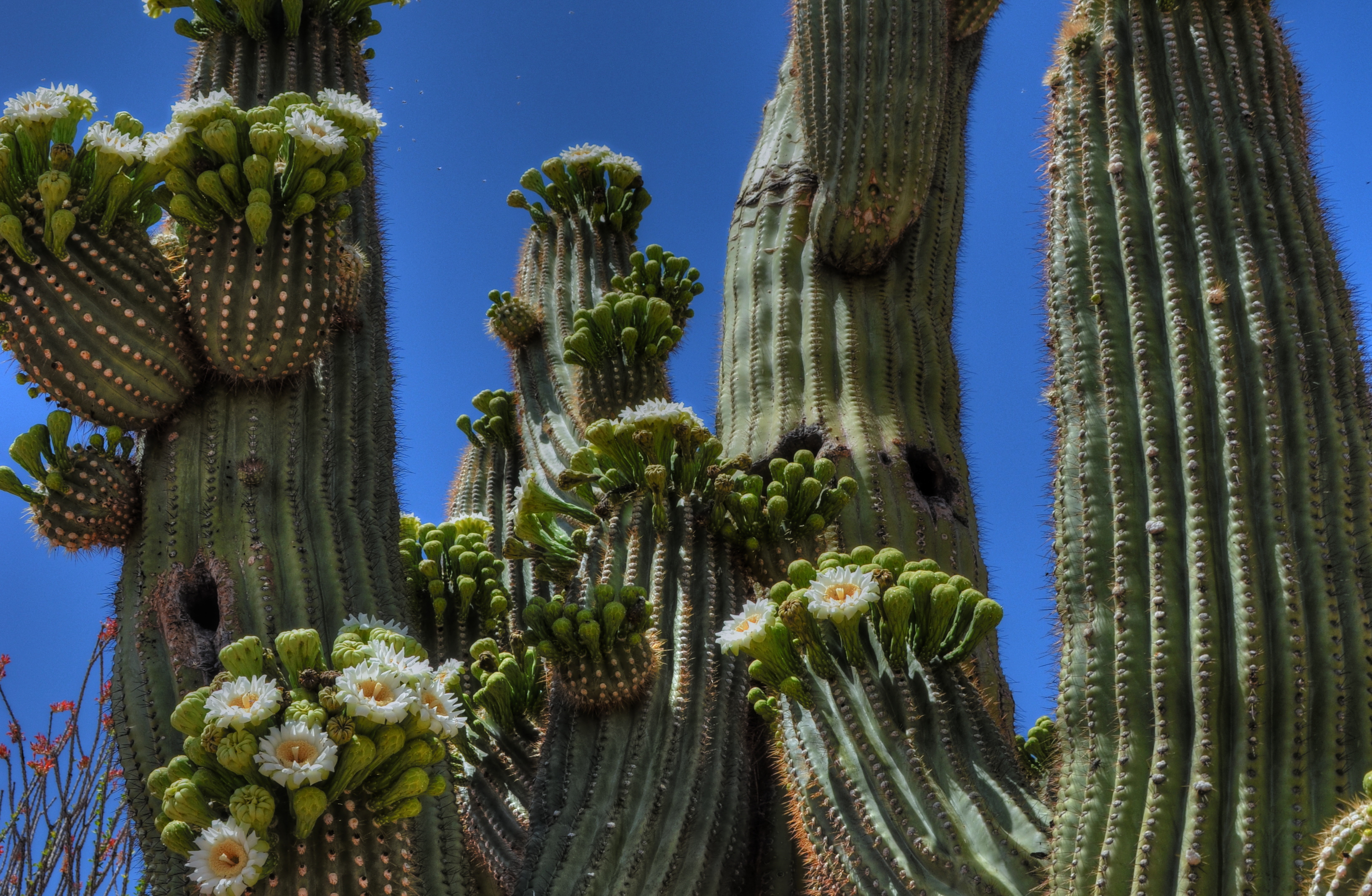 Having left my bounce card at home as well (I was on foot and truly traveling light), I noticed that the head was underneath a low over-hanging porch roof, something you just must have on the front of an Arizona business in summer. Going totally into what-the-hell mode, I stuck my flat left hand just under the bottom of the pop-up flash and angled it upward about 15 degrees to create a crude bounce off the roof ceiling, allowing the light to soften as it came down upon the top of the head. It took a few tries to avoid creating an uber-white Aurora Borealis effect on the ceiling, and I had to move my feet around to figure out how to get some of the light to cascade down the head’s front and illuminate its features. I also had to bump the ISO up a bit to compensate for the fall-off in the flash at the distance I was standing, but, at the end, I at least got something. Moreover, like the woman at the concert, what I had picked up in technique more than compensated me for the fact that the shot wasn’t strictly an award winner.