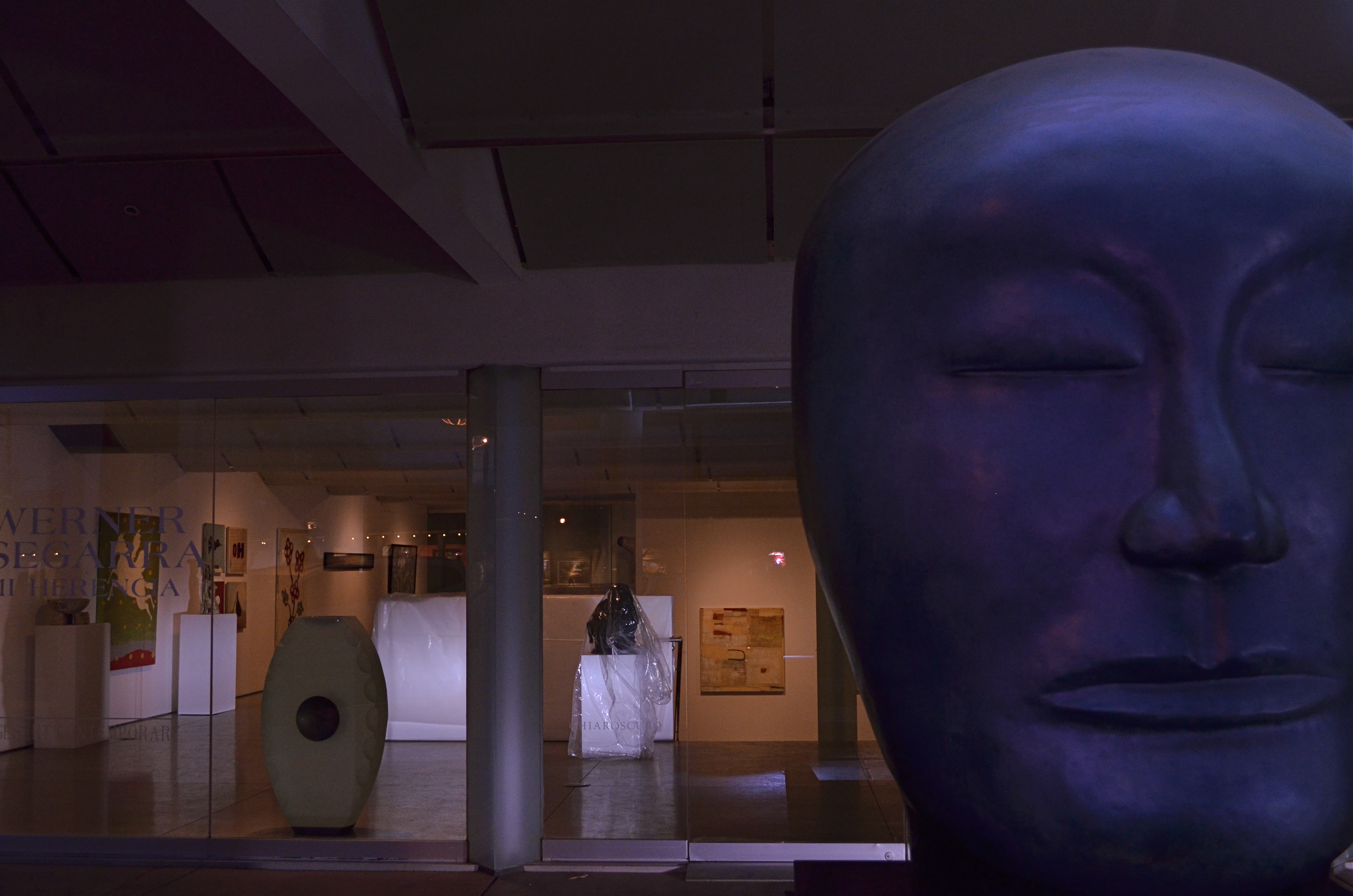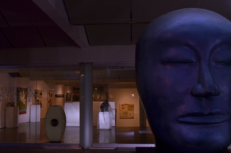 Sometimes, just the sheer unwillingness to go home empty-handed provides you with real delight. Last week, I was making the rounds at an area gallery district, the type that does nightly “art walks” as a way of speed-dating potential customers. Many of the best shots I get in these surroundings are near or just after dark, and I always like peeping into the windows of shuttered businesses at night, since some key character of light and mood invariably occurs. For the shot shown above, I fell in love with one gallery that had a kind of sentry posted outside, in the form of an enormous sculpted head. Its aloof expression reminded me of a cross between Easter Island and Blue Man Group, and I really wanted him/her/it to be a part of the shot. However, I had not brought an external flash unit with me, and the sculpture was reading 100% dark in contrast to the interior of the gallery. I was desperate, but not desperate enough to use straight-on pop-up flash, which would have blown the face out completely and destroyed any chance at a moody feel.