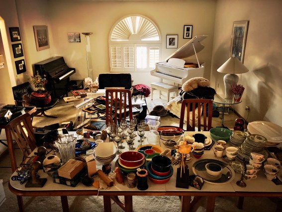 The scene here is something of a mish-mosh, in that it’s an early study of what-goes-what-stays, done before any final decisions for any of it were made. Hence, I can pick out objects, here and there, that we actually brought with us, some that went to estate sale, some that had yet to be ruled on, and a few things we thought we could sell that eventually went to charity. The reason this photo recently bobbed back up into my consciousness was because Marian and I are presently in the “did we leave that behind, or did we pack it?” phase, which looks as if it will go on for the next immediate….millennium. There were other photos made during the madness, including many tabletop commemorations of school and art projects by her two children going back over thirty-some years. Every museum isn’t a house, but every house is a museum. I could sum this all up by saying something philosophical about how little you can live with once you make a few tough calls, but I don’t want to congratulate myself too much while I am still occasionally opening boxes filled with “why the hell did I bring this…..?”