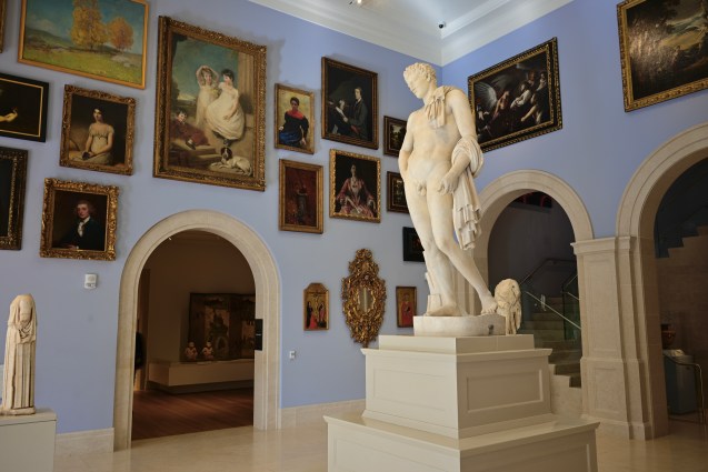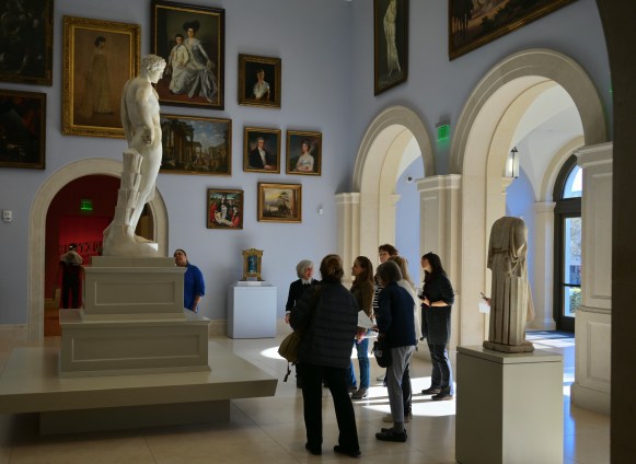 At this point in the history of photography, we have probably made almost as many images of other people’s images as we have made original photographs of our own. We cop a shot of a great painting; we snap a souvenir of a stunning statue; and then, there are those other kinds of “pictures of pictures”; those that are actually also of the surrounding spaces around and between them, as seen in galleries or museums. And while it may seem odd to think of light fixtures, benches, or visitors as part of the same composition as an art exhibit enshrined in those spaces, I find it an exciting challenge to take in entire rooms….paintings, furnishings and all, as a single piece, almost like a stage set.