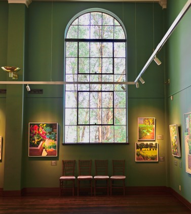 In the above shot of an art gallery in Santa Paula, California, what was once just one of many tall, arched windows in an old bank building becomes, under the careful curatorial eye, a centerpiece of the frame, affording a view of the outside world which both reflects and amplifies the beauty of the framed art. Everything works together, and yet nothing collides or occludes. Visually, there is space for all of it to happen, on equal terms with itself.