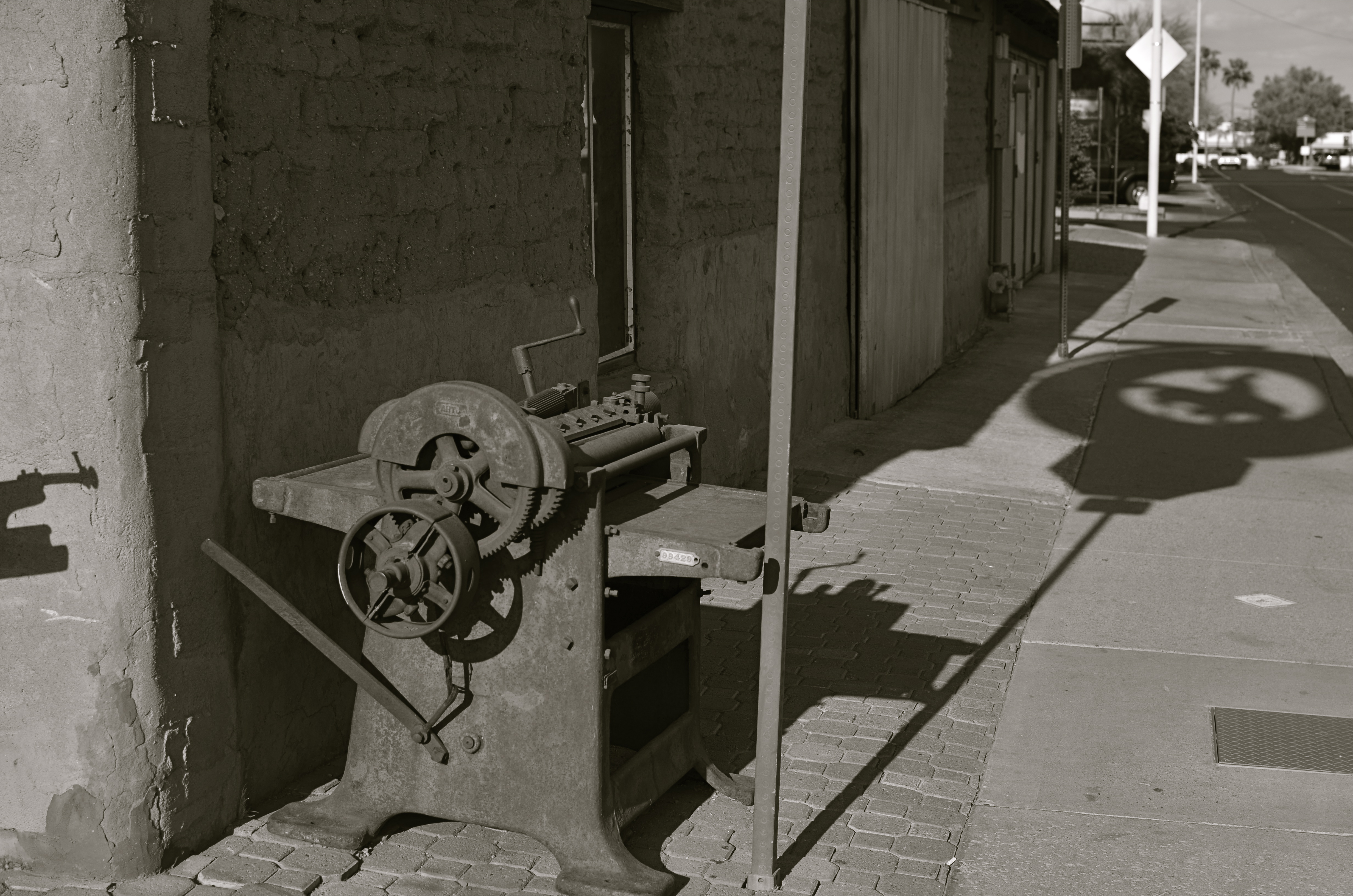 The long shadow of an unseen sign visible in the above frame lasted about fifteen minutes on the day of the shoot. The sign itself is a metal cutout of a cowboy astride a bucking bronco, the symbol of Scottsdale, Arizona, “the most western town in the USA”. The shadow started as a short patch of black directly in front of the rusted bit of machine gear in the foreground, then elongated to an exaggerated duplicate of the sign, extending halfway down the block and becoming a sharper and more detailed silhouette.