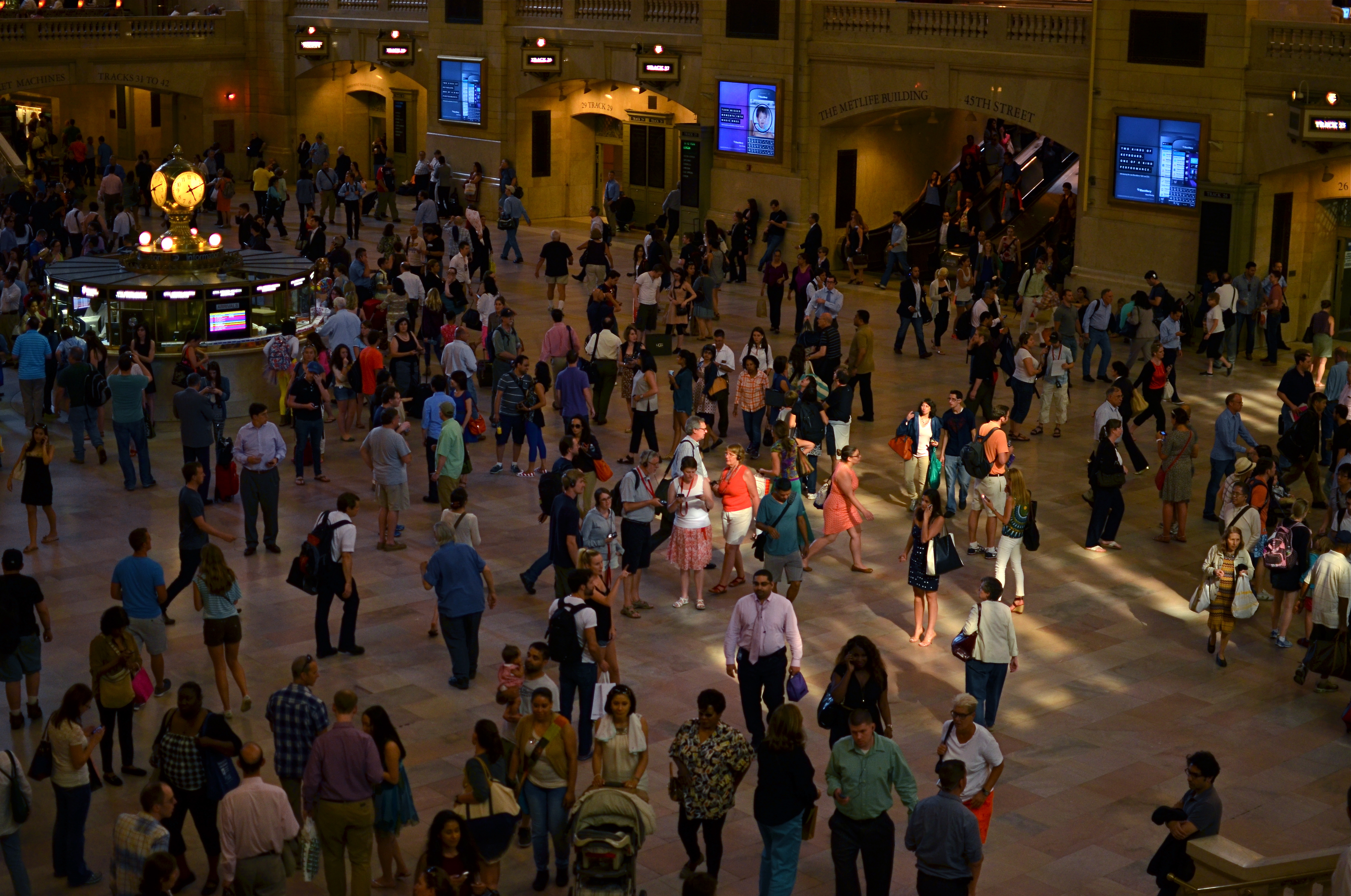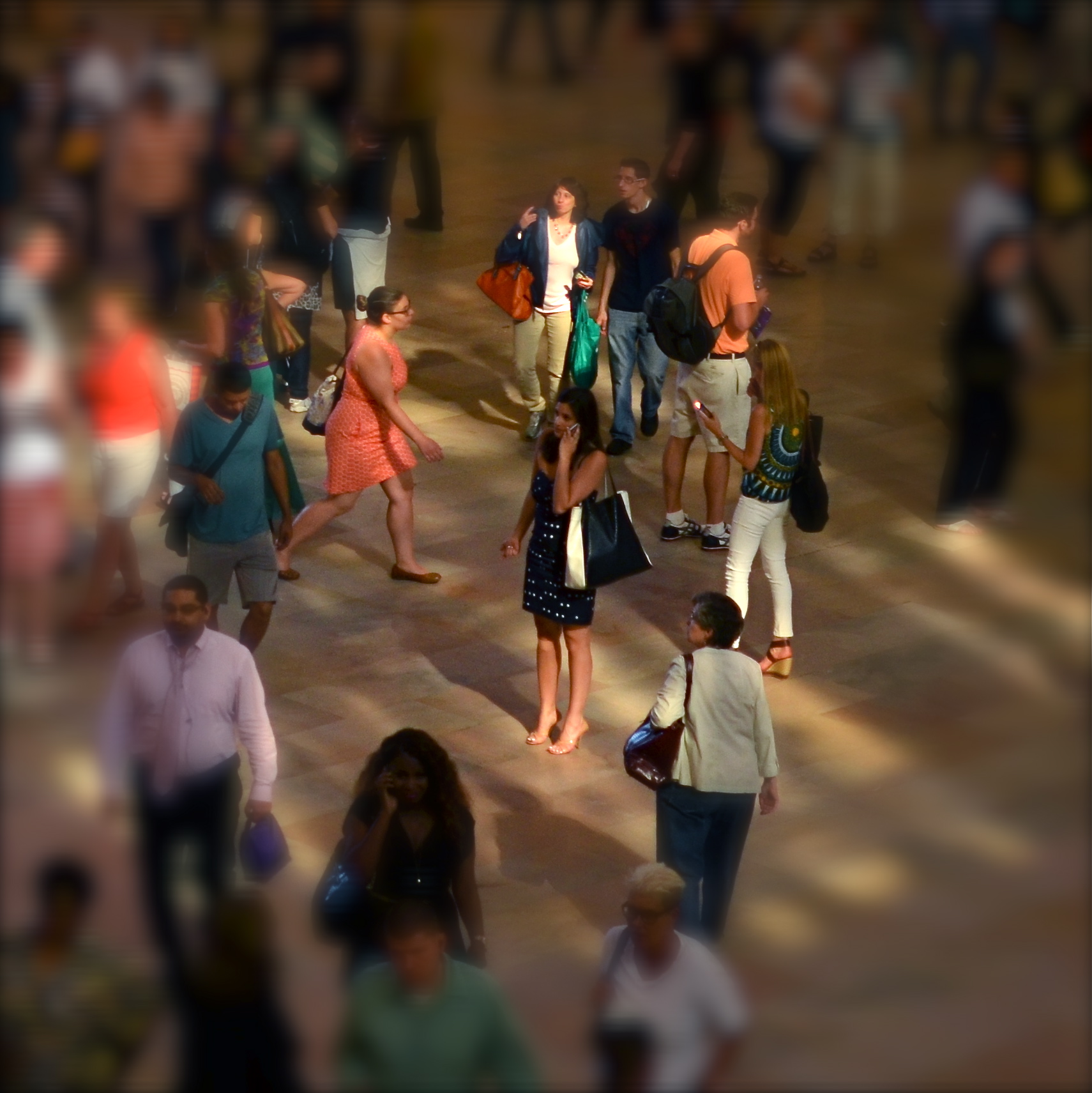 During my last visit to Manhattan, I was determined to explore the limits of natural light streaming from the gigantic windows of the main terminal floor at Grand Central, and, for the most part, I framed the place’s architectural features in such a way as to dwarf the scurrying humanity heading to their various destinations. I did shoot a few floor shots as “crowd pieces”, but, upon editing, I failed to look within those big groupings for any kind of individual story or drama. I chose the gigundo-windows master shot I wanted, and left all the other frames in the dust.