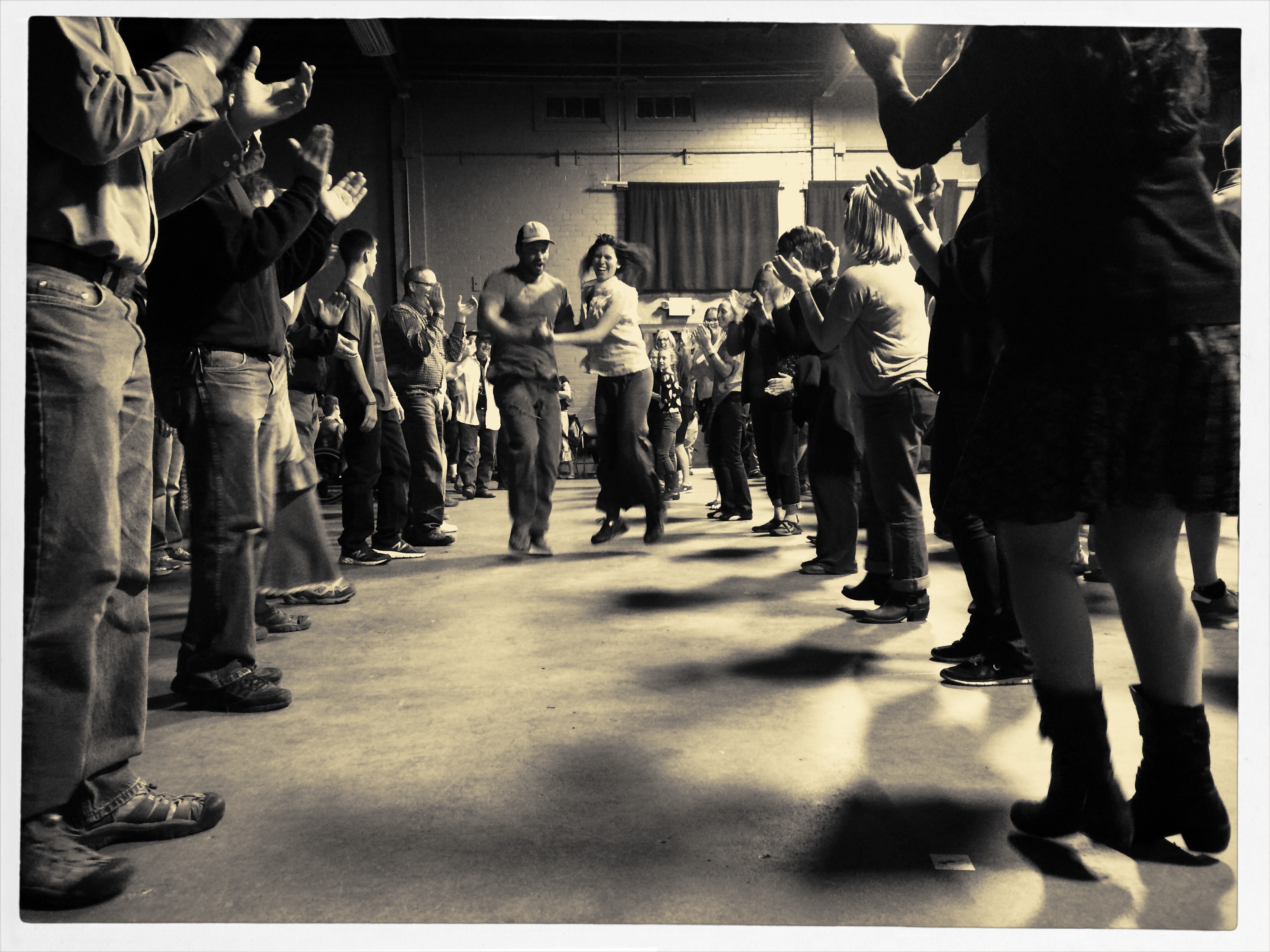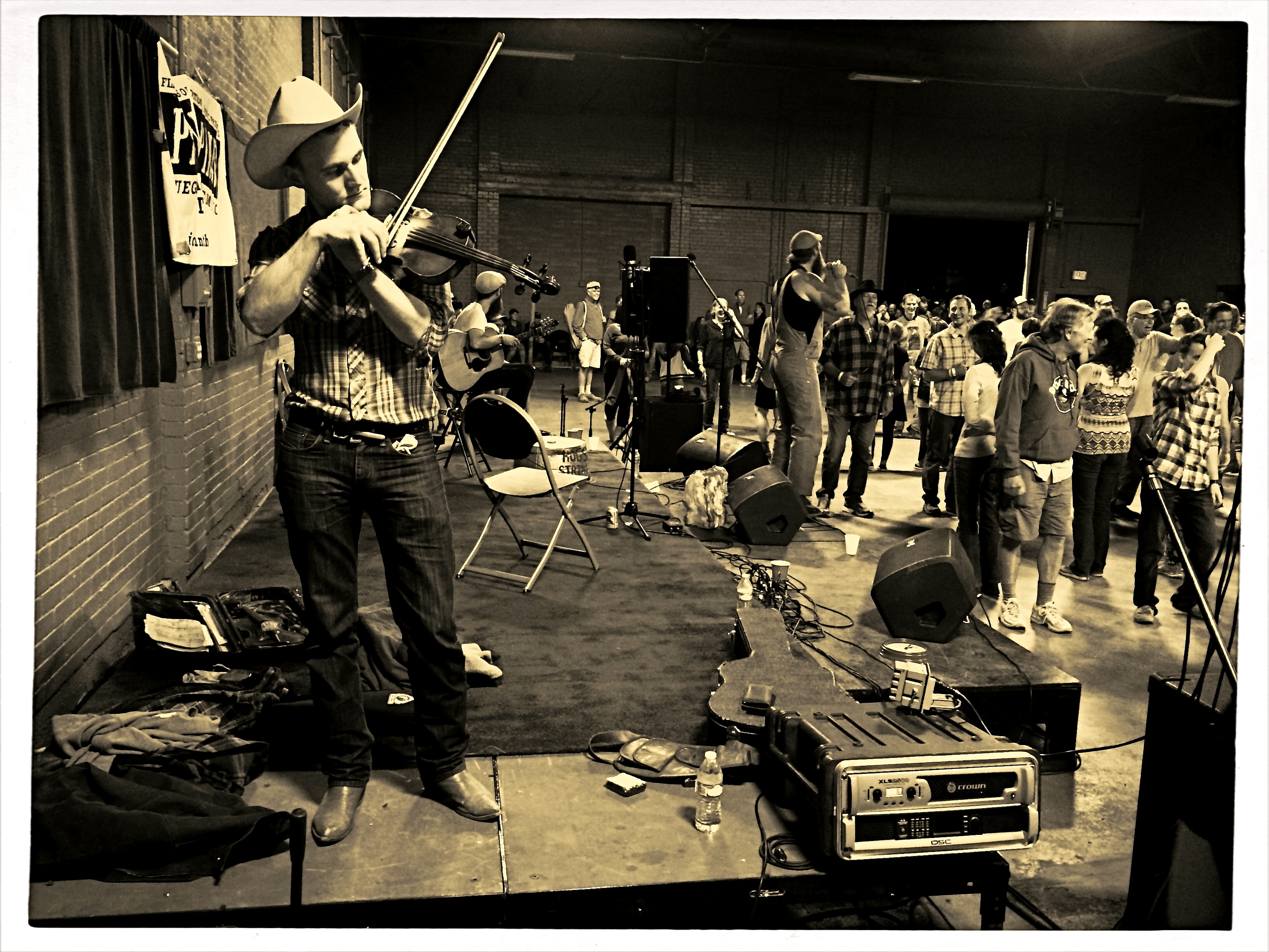 In the above situation, I was shooting through the storefront window of a combined art studio and wine bar (yes, I hang with those kind of people), and, given that the neighborhood I was in regularly packed folks in on “gallery hop” nights, the place was pretty jammed. The original full frame showed everything you see here, but also the connecting corridor between the studio and the wine bar which was, although still crowded, a lot less claustrophobic than this edited frame suggests.