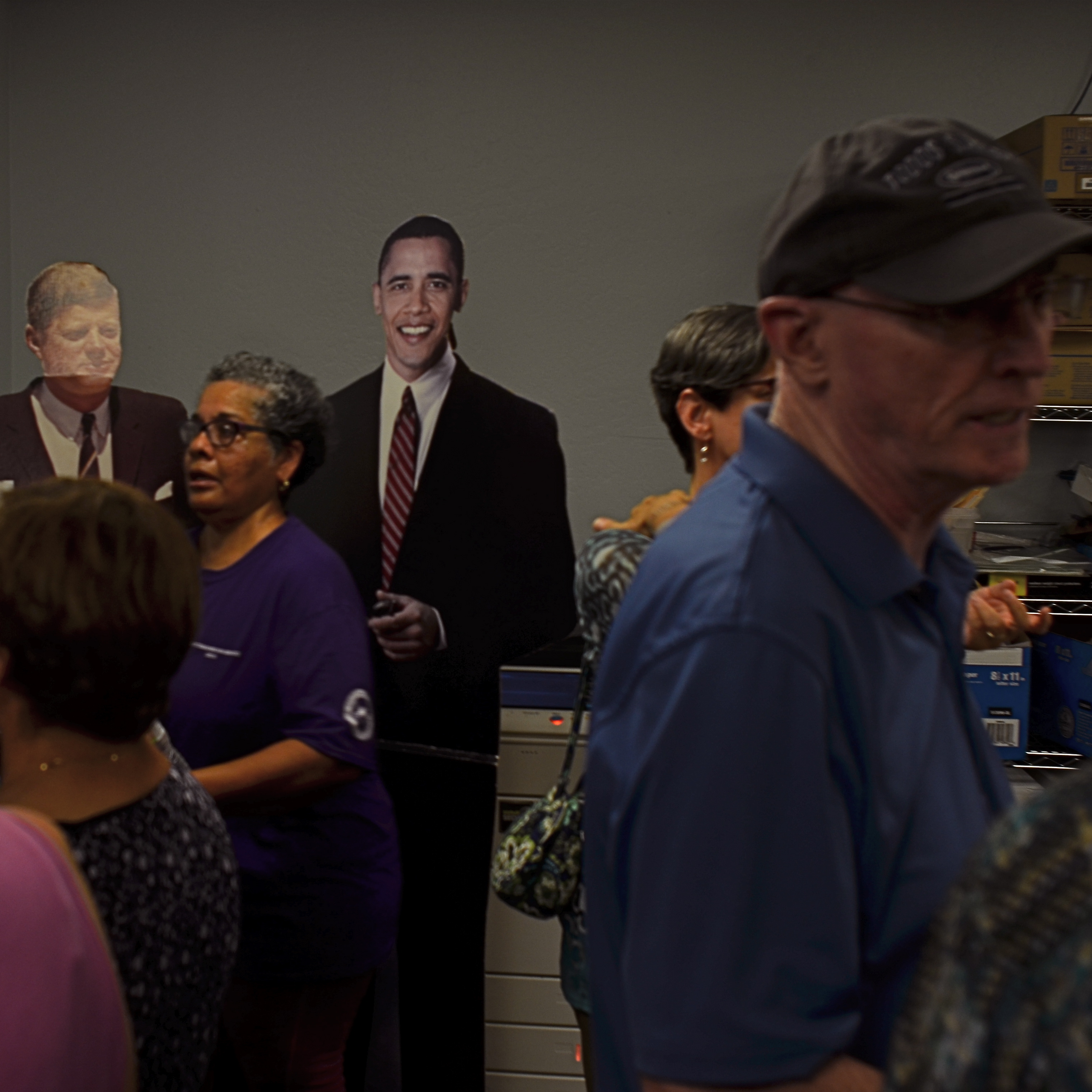 The shot at left just had to be snapped, since it speaks to the kind of stuff that passes for entertainment on a day when the outside temperature at a Democratic rally in Arizona tops a balmy 108 and a campaign office built for several dozen volunteers attempts to host a horde of nearly 800. It makes cramming twenty clowns into a Volkswagen look like a card trick. And, apparently, on this particular day, the staff thought the best thing to facilitate the flow of foot traffic was to park a pair of life-size cutouts of JFK and President Obama right at the entrance, where people could slow down even further in search of a souvenir photograph, not by their next choice for Chief Executive, but a living president on his way out and a dead president more than half the crowd only knows through newsreel footage.