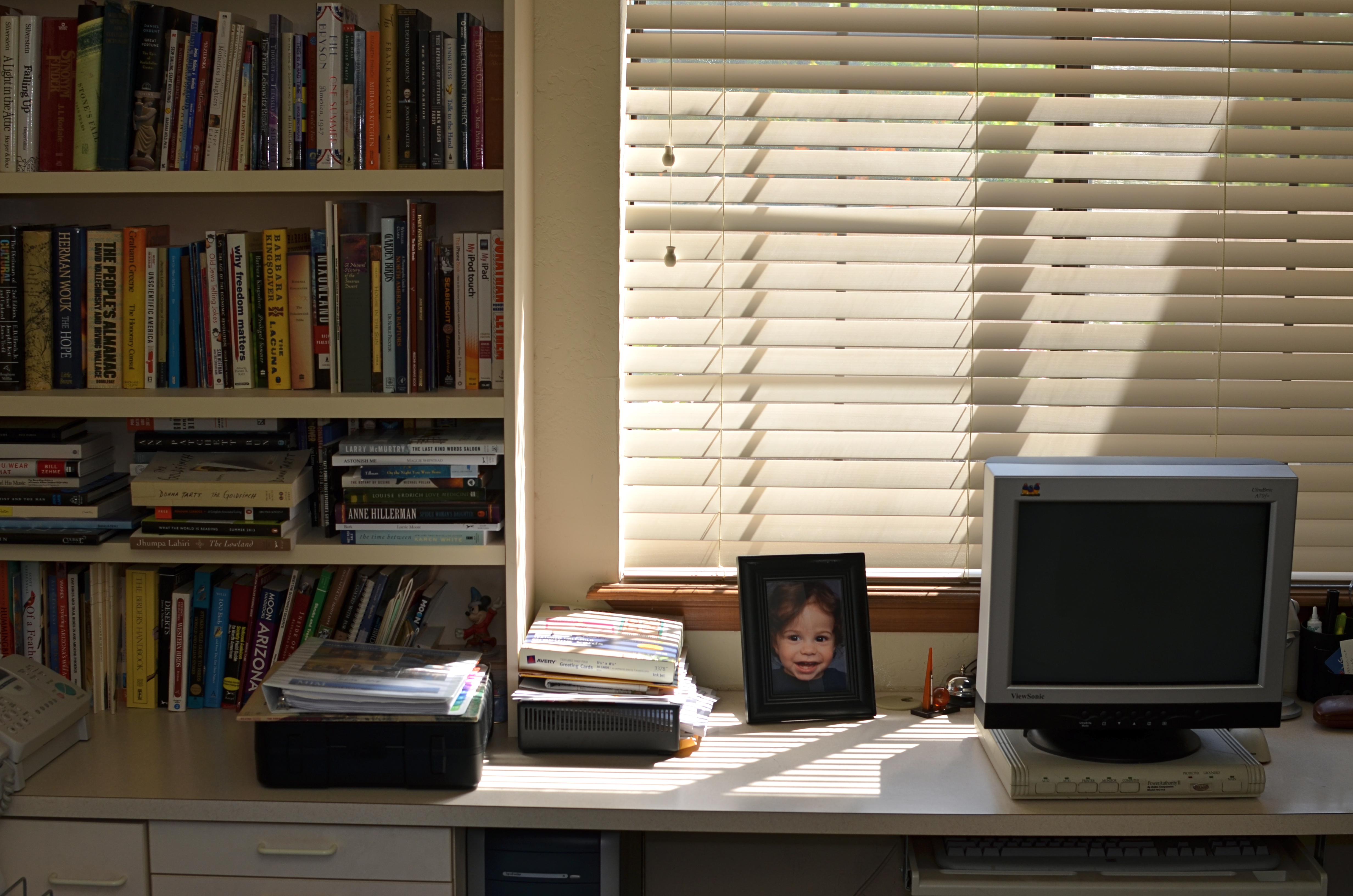 In this first attempt to capture the early morning shadows and scattered rays in my office at 1/100 sec., f/5.6, ISO 100, you’ll see that the window is a little too hot, and that nearly everything ahead of the window is rendered into a silhouette. And that’s a shame, since the picture, to me, should be not only about the window light, but also its role in partially lighting a dark room. I don’t want to make an HDR here, since that will completely over-detail the stuff in the dark and look un-natural. All I really need is a hint of room light, as if a small extra bit of detail has been illuminated by the window, but just that….a small bit.