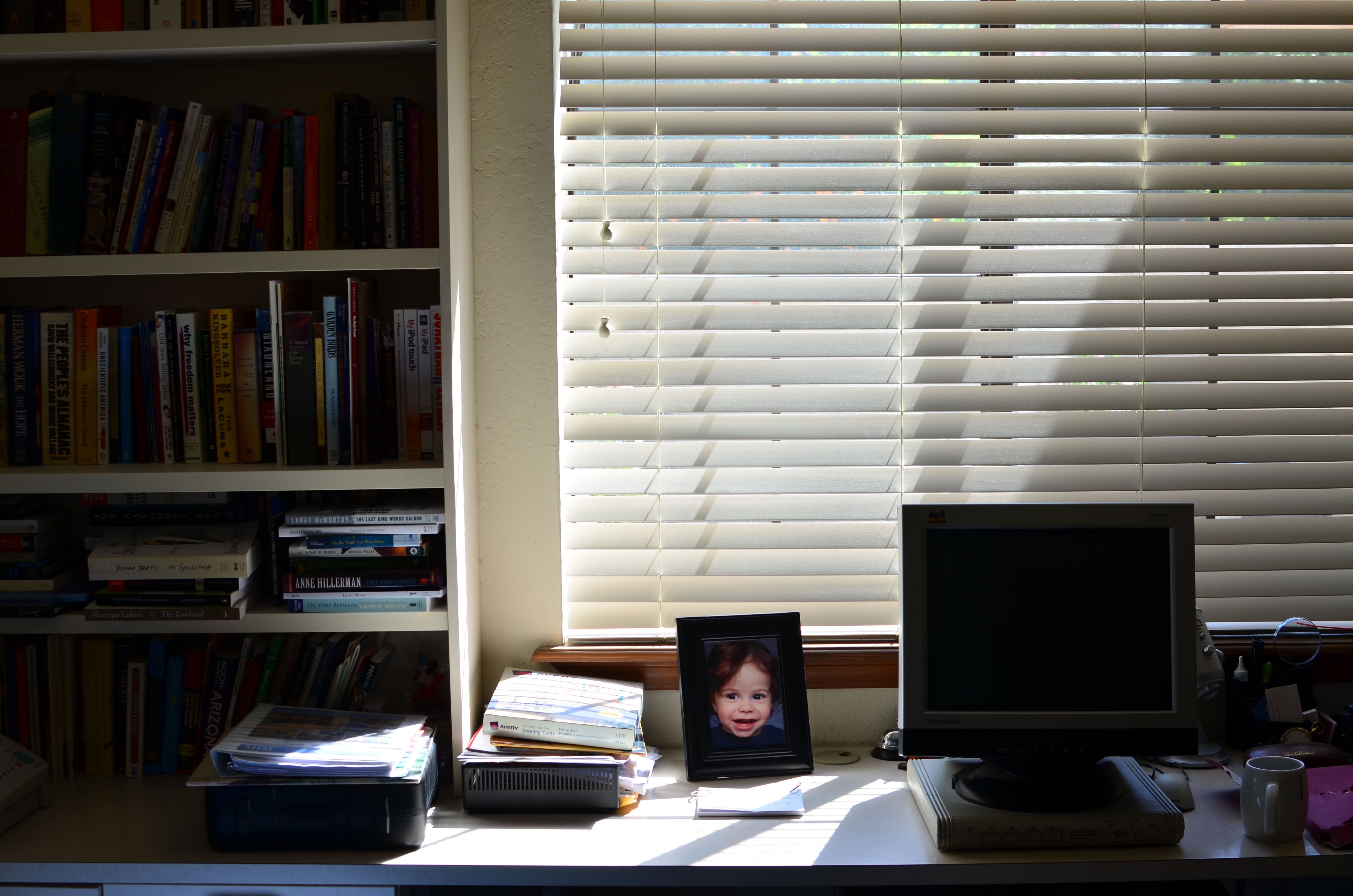 In the second attempt, I have actually halved the shutter speed to 1/200 to underexpose the window, but have also used my on-camera flash with a bounce card to ricochet a little light off the ceiling. I am almost too far away for the flash to be of any real strength, but that’s exactly what I’m looking for: I want just a trace of it to trail down the bookshelf, giving me some really mild color and allowing a few book titles to be readable. The bounce plus the distance has weakened the flash to the point that it plausibly looks as if the illumination is a result of the window light. And since I’ve underexposed the window, even the wee bit of flash hasn’t blown out the slat detail from the blinds.
