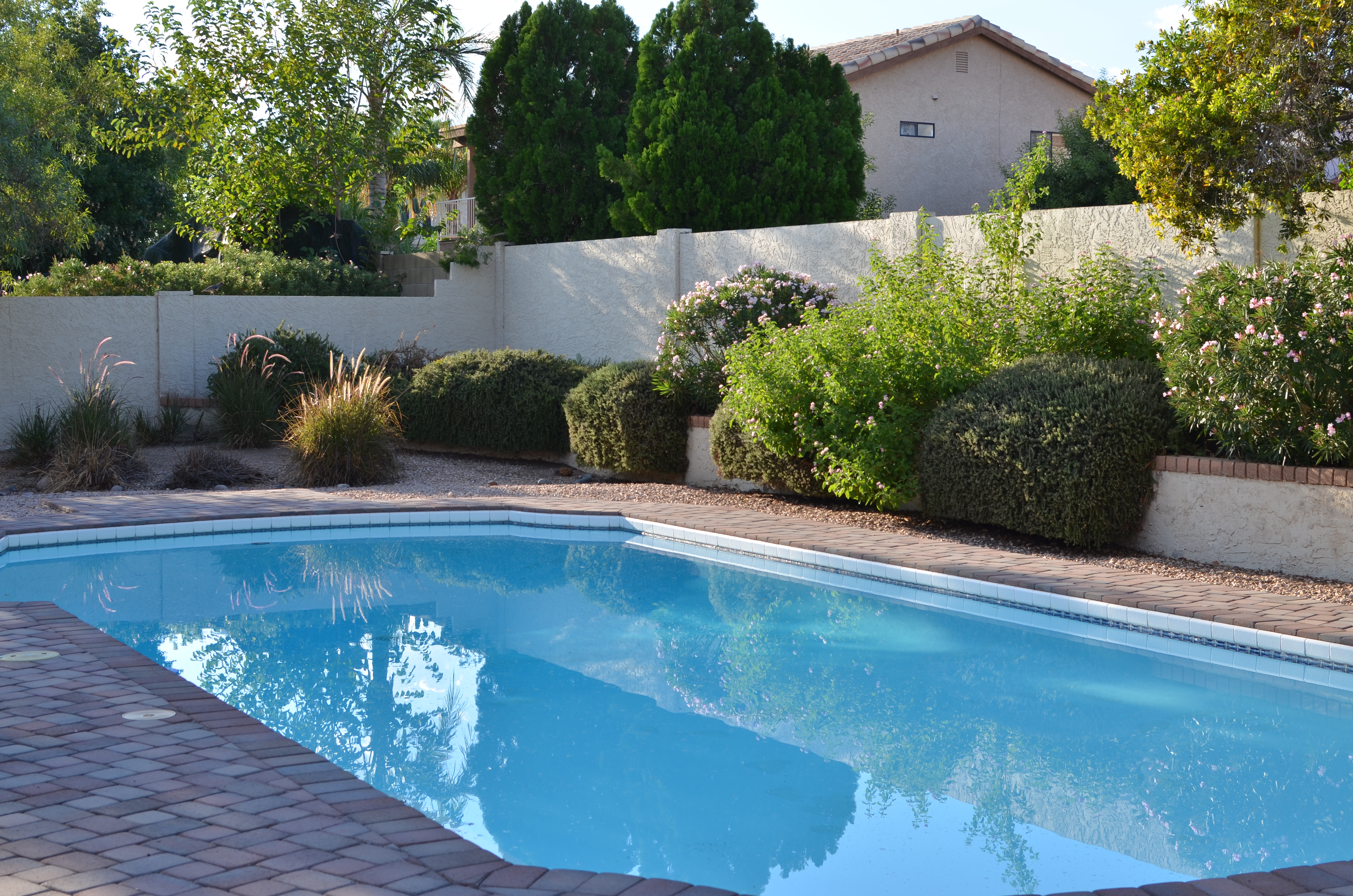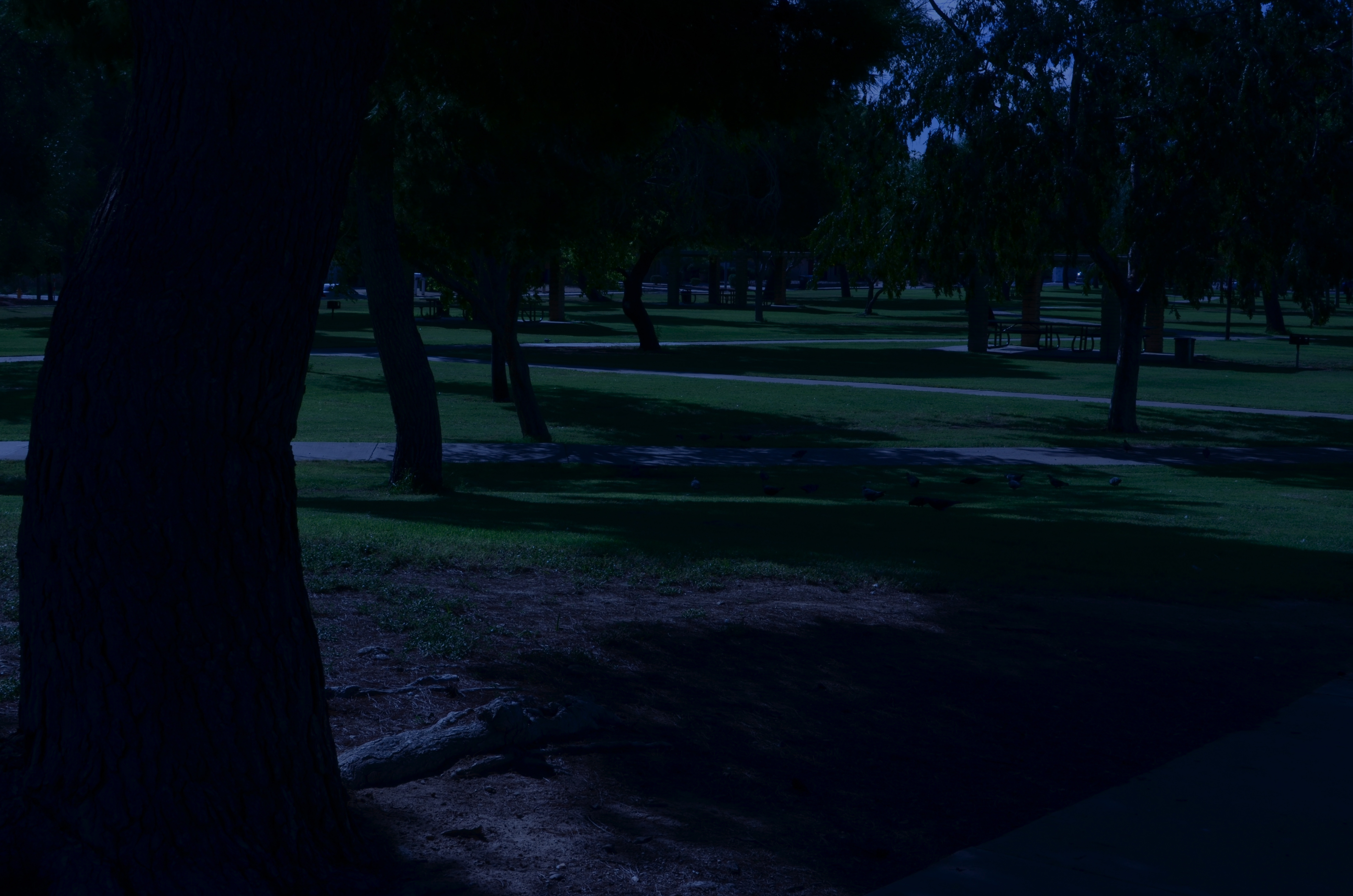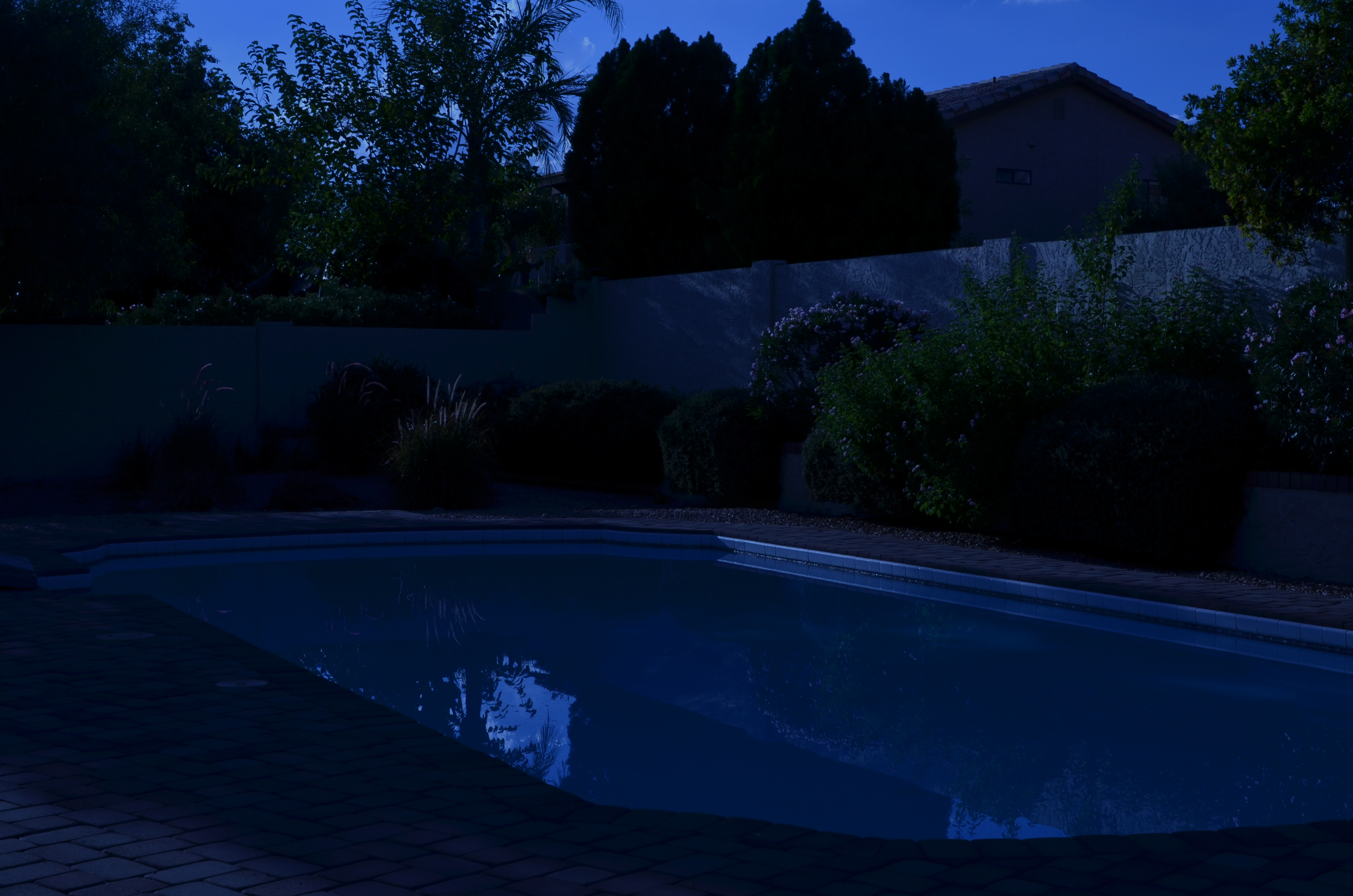 Moonlight night around the poolside, only not really: a “day-for-night” shot taken at 5:17pm. 1/400 sec., f/18, ISO 100, 35mm, using a tungsten white balance.