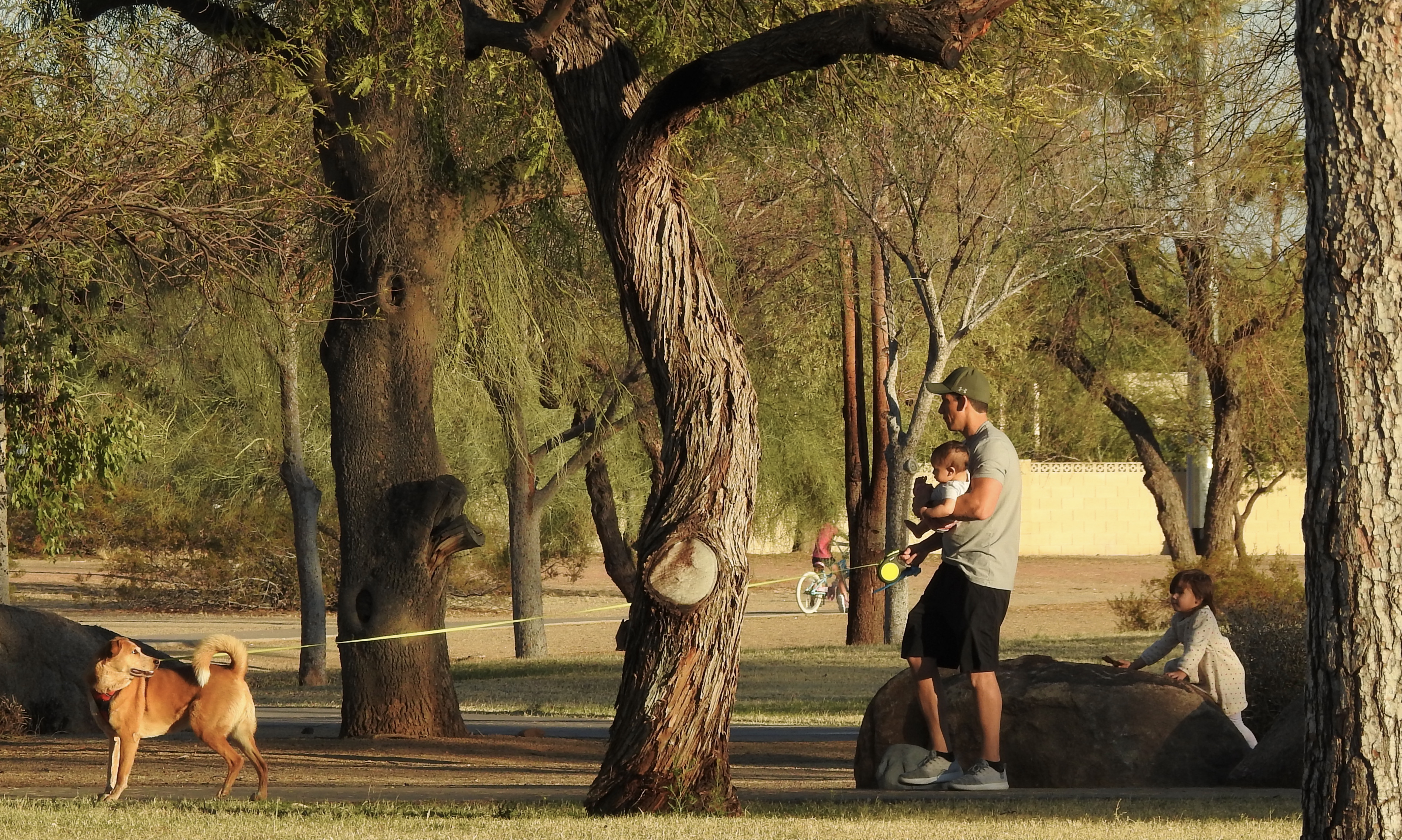 As stated before, the more people you decide to include in a street shot, the more choreography there is to fuss over. In the “day-out-with-dad” scenario shown here, I had several stories that all wanted telling at the same time. In some frames shot over the space of a minute (about eight), various players were all contending for star status. In some shots, the father seemed to be guiding the kids and the dog. In a few, the dog’s personality as explorer-at-large seemed to place his energy in charge. In yet more, the young girl seemed to be trying to run things by standing atop the rock on which, in the selected frame, she’s seen leaning. Thus, in the final version, she’s a little more passive, Dad is trying to keep things in balance, and the dog is definitely on point as the overall leader of the expedition.