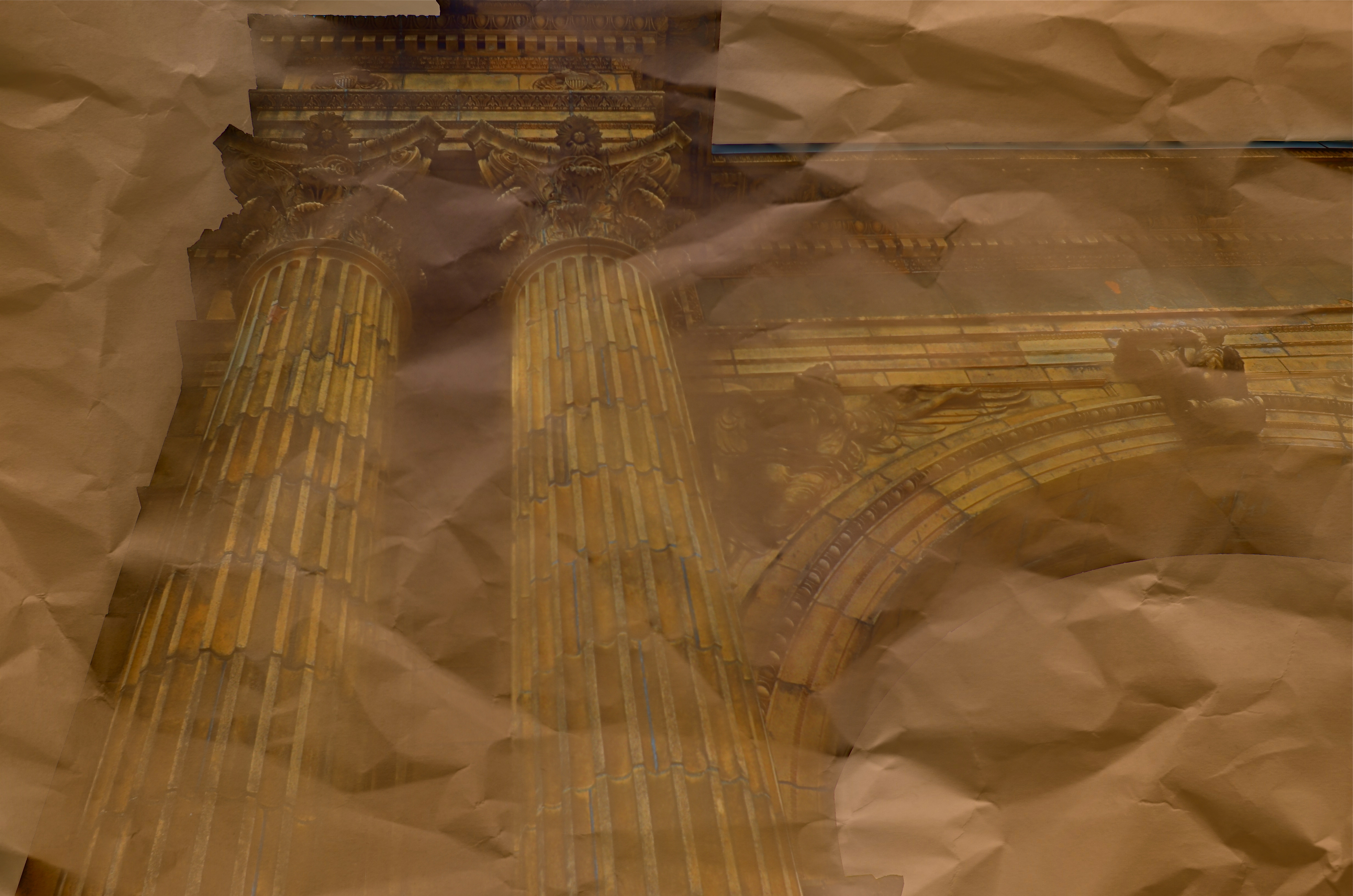 I have taken a few runs at the subject myself over the years, and find that partial views work better than views of the entire arch, which is crowded in with plenty of apartment buildings, parklands and foot traffic, making a straight-on photo of the structure busy and mundane. For the above image, I imagined that I had recovered just an old image of the arch….on a piece of ancient parchment, a map, perhaps an original artist’s rendering. I shot straight up on a cloudy day, rendering the sky empty and white. Then I provided a faux texture to it by taking separate a sepia-toned photo of a crumpled piece of copier paper and fusing the two exposures (the HDR software Photomatix’ “exposure fusion” feature does this easily). Letting the detail of the arch image bleed randomly through the crumpled paper picture created a reasonable illusion of a lost document, and I could easily tweak the blend back and forth until I liked the overall effect.