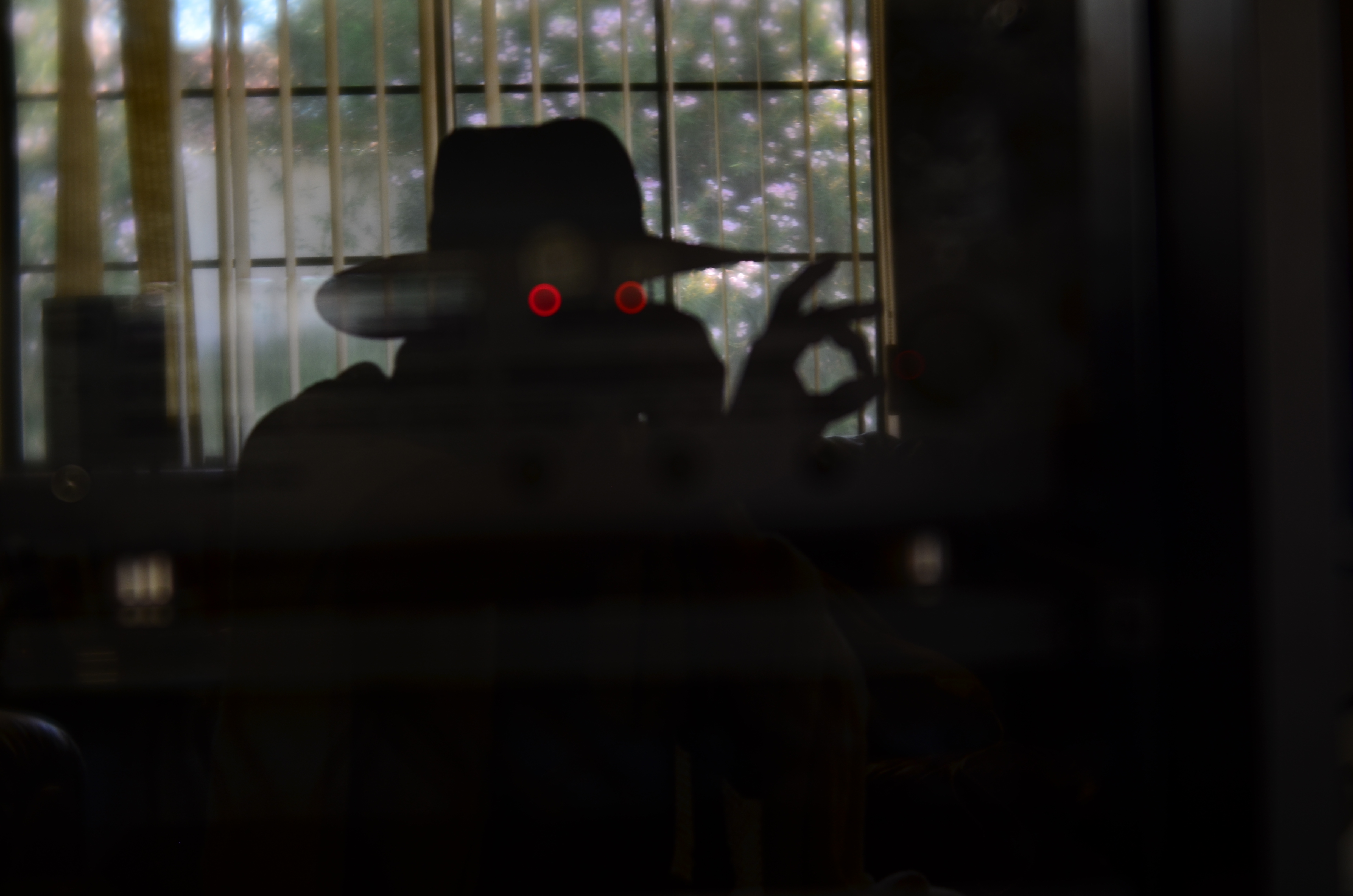 At first, I was trying to take a picture of my back yard, which over my shoulder, as it was reflected in the glass cabinet door in front of me. I was about to kill the power on the amplifier on a shelf behind the door when a test shot revealed something unusual. At my chosen aperture, the amp’s two red LEDs weren’t reading as sharp points of light, but as diffuse outer circles surrounding soft inner circles, almost like a pair of feral eyes. And at that point, the garden scene slowly started to take a back seat.