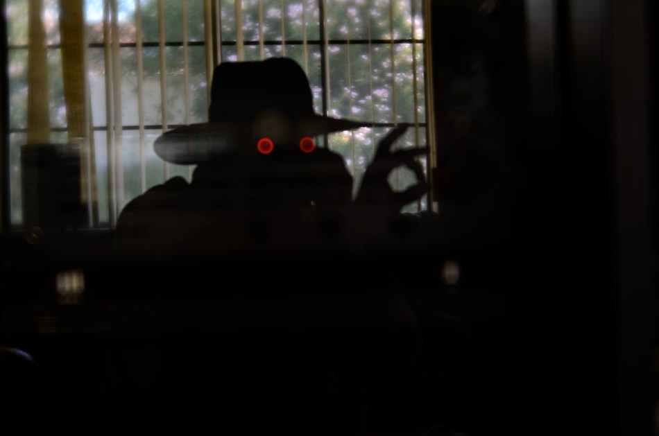 Shooting the glass door at a slight angle made my body register as a reflection, while shooting straight on turned me into a silhouette, which would become handy. Now that I was just a shape, I could be anything, so I positioned myself to where the dots indeed appeared to glowing, spooky eyes. Shooting with my right hand, my body details now masked by shadow, I crossed my left hand over beyond the right edge of my body, posing it to look as if I were stealing something, or perhaps twisting the dial on a combination safe. Having thus established the behavior for the character I was now creating, I grabbed my wife’s garden hat and threw a bed blanket around my shoulders for some sinister atmosphere. Click and done, with my newly imagined Phantom Blot plotting his way into the house. I didn’t know the whole story, but I knew when to stop playing. Total time investment: five big minutes.