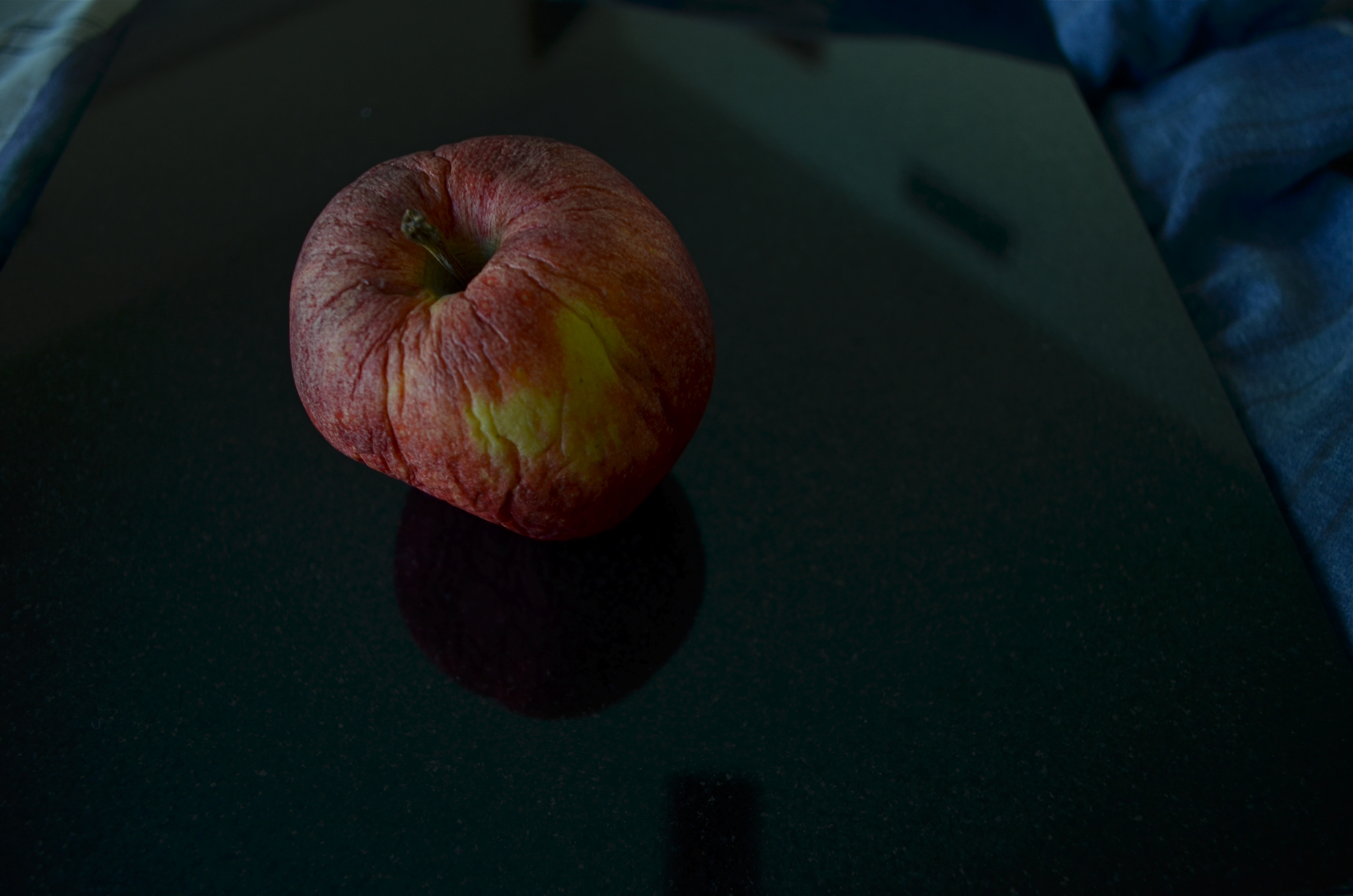 So I set this old soldier on a slab and shot away for about a dozen frames. Window light, plain as mud, really zero technique. The colors on the apple were still bright, but the wrinkles had become furrows now, sucking up light and creating strange shadows. Something was leaving, collapsing, vanishing before my eyes, and I wanted to stop it, if only for a second.