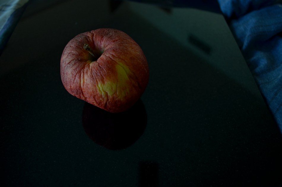 Once upon a time there was a very old apple. Shot real wide and in tight to suck up as much window light as possible and bend the shape a little. 1/50 sec., f/3.5, ISO 160, 18mm.