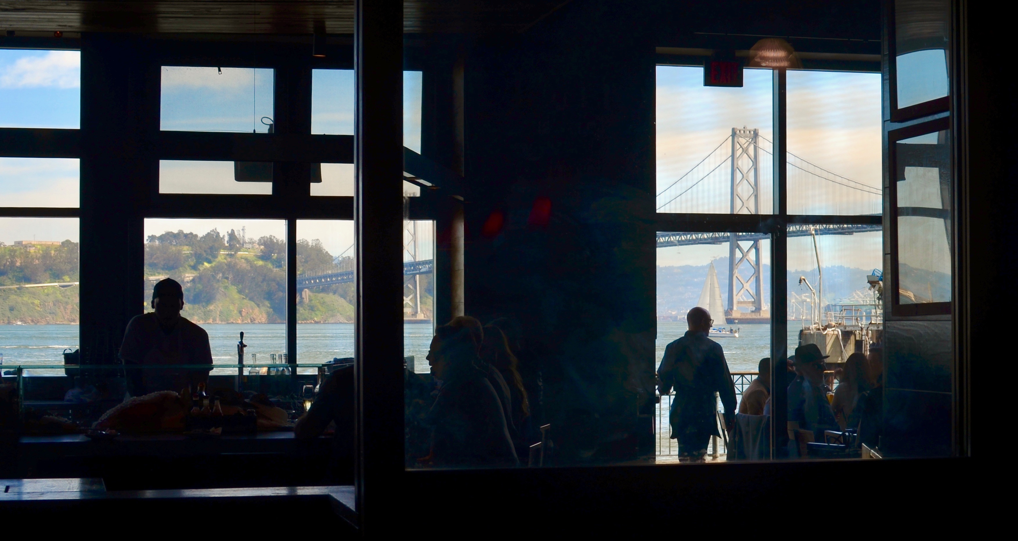I was walking around the back of the old Terminal building in San Francisco, which is the place that all the city’s ferries used to dock and disembark before the Golden Gate Bridge was built, making many daily boat trips across the bay unnecessary. The building now houses eateries, produce stands, and an insane amount of tourist traffic, much of it crowded into restaurants such as the one seen here. The view out the back includes the Bay Bridge and the local ship traffic, as well as the occasional sailboat, such as the one seen here. I exposed for the scenery, leaving the restaurant’s patrons and workers in shadow. The scalloped, rather “peek-a-boo” view that resulted keeps the image from being a standard postcard shot, but while that “purity” is lost, what’s gained is a smidge of mystery about the shadowy folks in front. What are their conversations about? Why are they here?