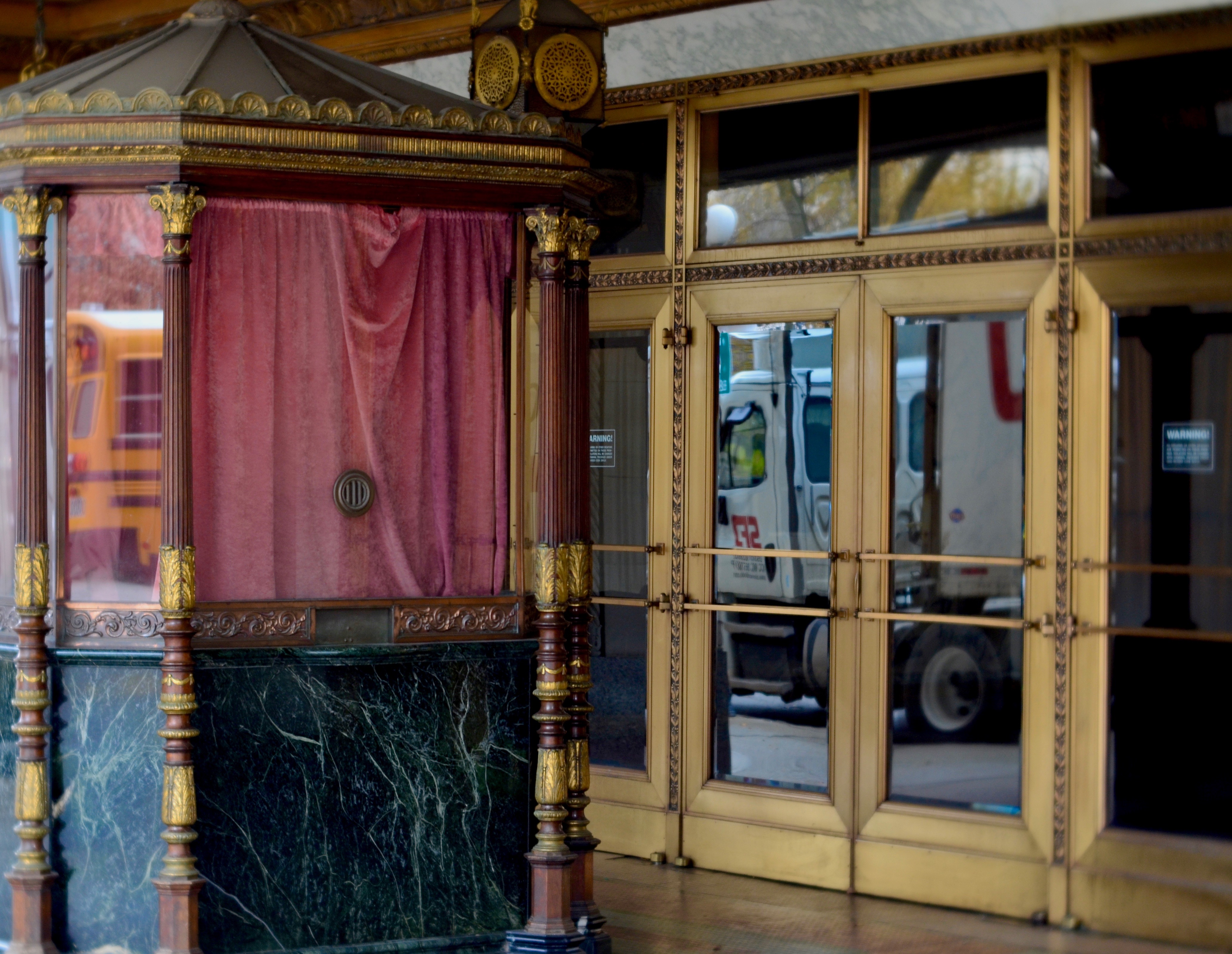 The grand ticket kiosk seen here, which still graces the 1926 Ohio Theatre in Columbus, is now part of a vanished world: we don’t associate its details with elegance or “class” anymore. We don’t look to dedign elements of the old world to frame the new, as we did in the age of the flapper and the flivver. Images made of these disappearing gateways are poignant to the old and bizarre time machines for the young.