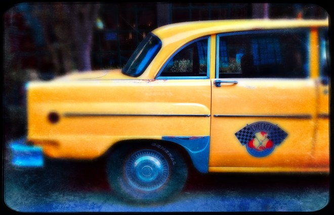 The problem with taxis, now, is to show not only the physical object itself, but to visually suggest that it is slowly going ghost, fading into extinction. In such situations, I find myself with the always-tricky test of trying to photograph a feeling, finding that mere reality is, somehow, inadequate to the task. It bears stating that I am, typically, a straight-out-of-the-camera guy; I make my best effort to say everything I have to say before I click the shutter. That’s neither right nor wrong; it’s just the way I roll. And so, for me to lean heavily on post-tweak processing, I have to really be after something specific that I believe is outside of the power of the camera itself. The above shot, leaning heavily on such dream-feel, is even more ironic, because the Checker in question is no longer a working unit, but a prop parked permanently in front of a funky-chic boutique hotel. In other words, a museum piece. A relic.