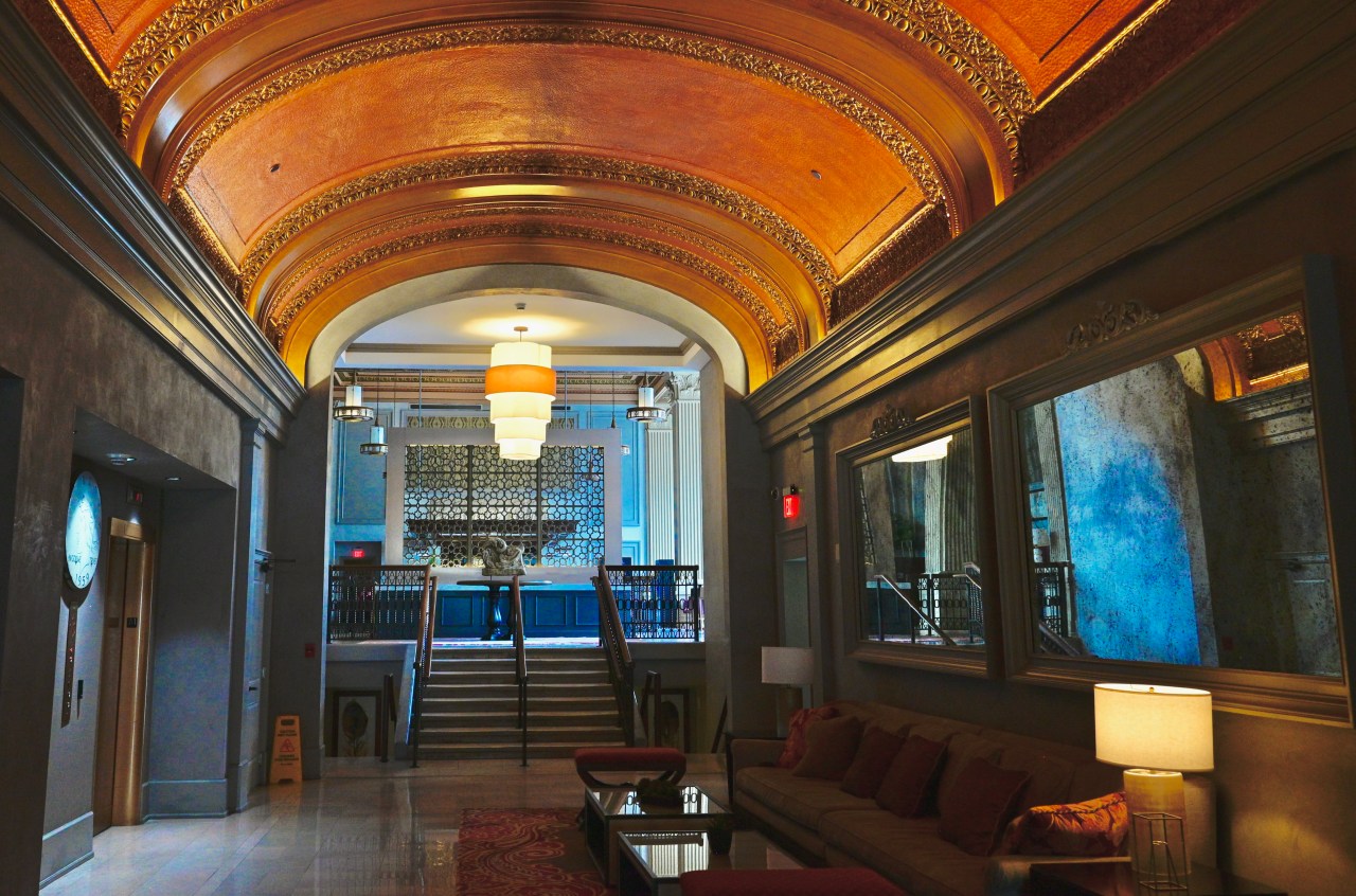 The foyer of the restored Citizens Building, a 1917 bank-turned-condo community in Columbus, Ohio.