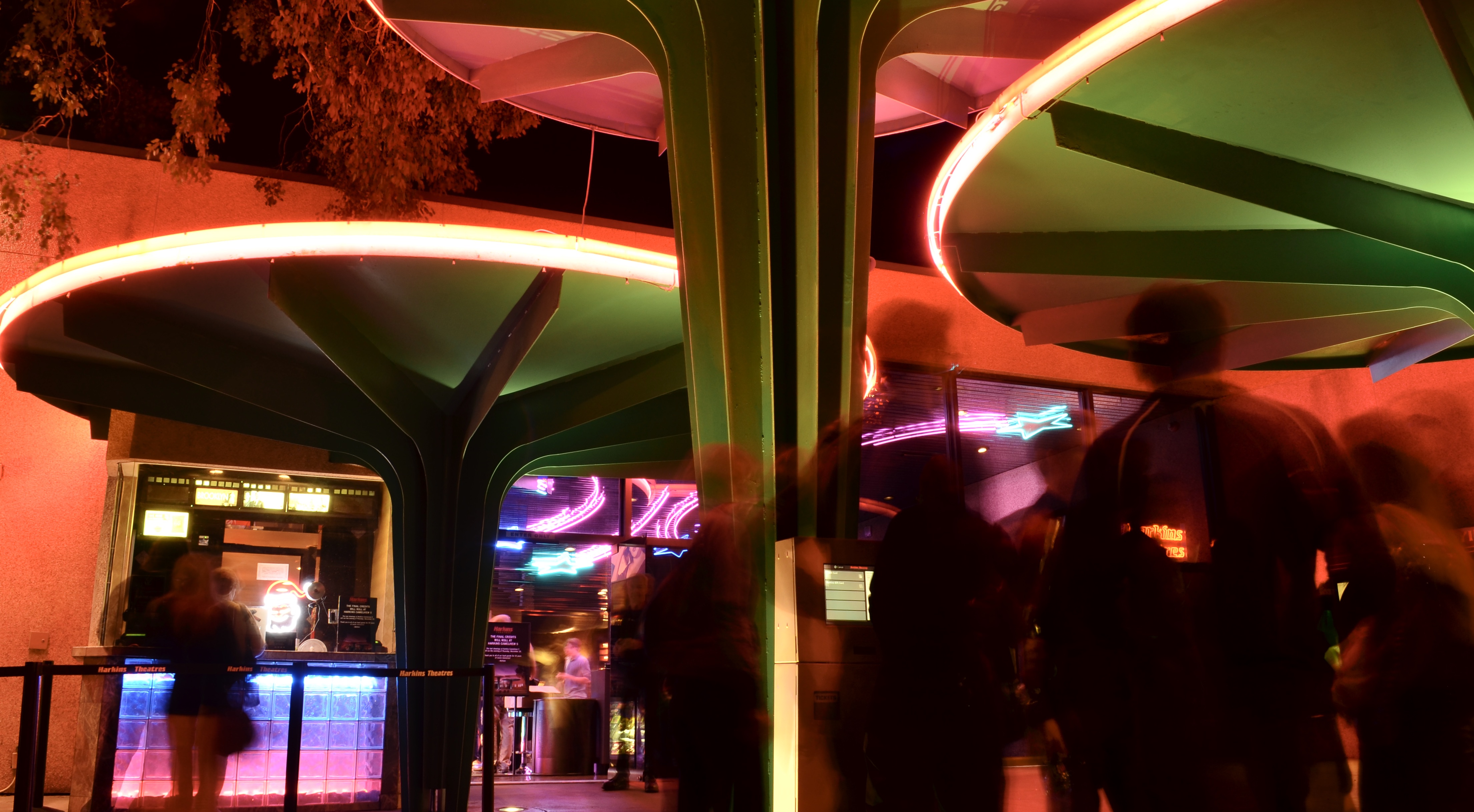 Today, with the lightning-fast response that is built into even the simplest cameras, that cow can only be summoned in a deliberate time exposure, typically with the camera mounted on a tripod. It’s fair to say that our motives for making these kind of images has changed over the years, again, mostly due to technological advances, including vibration suppression, wider ISO ranges, and enhanced noise reduction (which works hand-in-glove to clean up high-ISO pictures). Fact is, there are fewer instances than ever before in which long exposures are needed, unless we utilize them to generate the very artifacts that we used to wish we could eliminate. As one example, everyone eventually creates at least one “light trail” photo, letting cars zoom through a long exposure largely unseen while leaving the glowing paths of their headlamps hanging mystically in the air. And there are certain collapsed studies of long durations which can only be appreciated by prying the lens open for a few extra beats. In the case of the above image, I was photographing the final night before the closure of a local art cinema, which would soon be razed to make room for a bigger cineplex with more screens, more room, and far less charm. I felt as if a lot of Spirits Of Cinema Past were in attendance, and so mounted a tripod to turn the customers themselves into passing shadows, just like the many spectres that had flickered across the theatre’s screens over the decades. And that’s the strange time-travel feature of photography: one era’s annoyance is another era’s cherished effect.