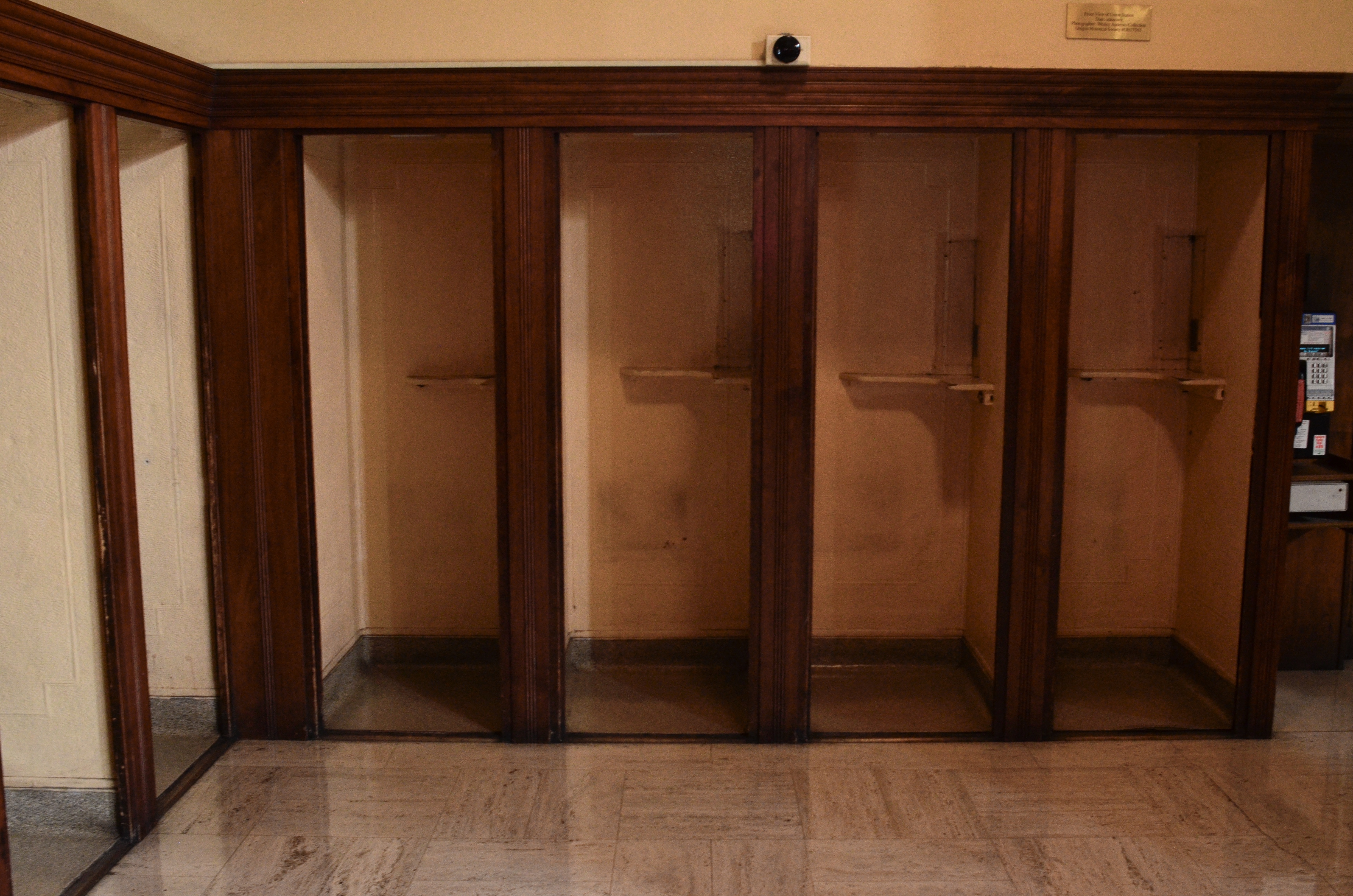 What renders something important enough for us to actively acknowledge it? Can some things become so common, so ubiquitous in our lives that we no longer see them? In the case of the vintage cabinets shown here: what, in our daily lives, could have been more commonplace, more taken for granted, than a bank of public telephone booths? How could these structures have been more widespread than they once were, in railway stations, courthouses, department stores, bus terminals, and a million other gathering places? And would that commonality have placed them somewhat below our radar, visually speaking? Now turn that on its head: what could be more noticeable than when this everyday object is rendered obsolete, its purpose vanished in a blink of technology? Will that thing now be more visible, or completely vanished, and for whom?