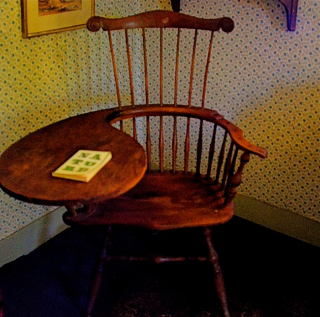 The house is lit only with indirect window light during the day, but with a fast prime lens and a decent eye, there’s more than enough soft illumination to work with to produce decent results (see left). In fact, just before my tour was to head into the room containing the desk, I had already harvested quite a few usable shots…so many, in fact, that I was getting teased by the others in the group…the usual “oh, another picture?” stuff. Uncharacteristically, I began to worry about whether I was holding everyone else up, and thus started to hurry myself, to shoot not as I intended, but in deference to what I thought others would like. By the time I got to Emerson’s chair, the light, my lens, even my own experience were all useless to me….because I wasn’t ready to shoot….but did anyway.