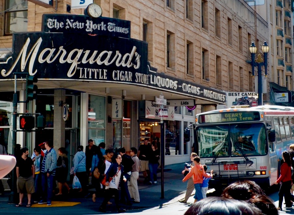 For nearly 100 years, San Franciscans in the heart of the Bay City’s business and tourist energy stopped at Marquard’s Little Cigar Store at the corner of O’Farrell and Powell for their morning paper, a bottle of spirits, or a pack of smokes. The neon sign announcing these delights was erected sometime in the ’20’s and stayed until Danny Ortega, who first climbed a ladder behind the counter to wait on customers while in early grade school, finally threw in the towel in 2005. At that point, the demolition of the store’s wraparound entrance seemed like a foregone conclusion. But local preservationists, eager to preserve the look, if not the function, of the old neighborhood, managed to get landmark status for at least the sign. What would henceforth happen beneath it would be up to the new leaseholders….in this case, a hat store whose smaller “LIDS” announcement can be seen in the 2012 image seen here. Several more years later, the neon tubing visible in this shot was also removed, still leaving most of the gloriously garish Marquard’s overhang intact, including its very West Coast promotion of the New York Times. This kind of half-a-loaf solution is becoming far more common in American cities, many of which are laden with buildings that can continue to cosmetically charm or educate, even as their original functions are either obviated or re-tooled. Movie theatres become live performance venues. Department stores become law schools. And cigar stores become landmarks, reminders of who we were just a few scant minutes ago.