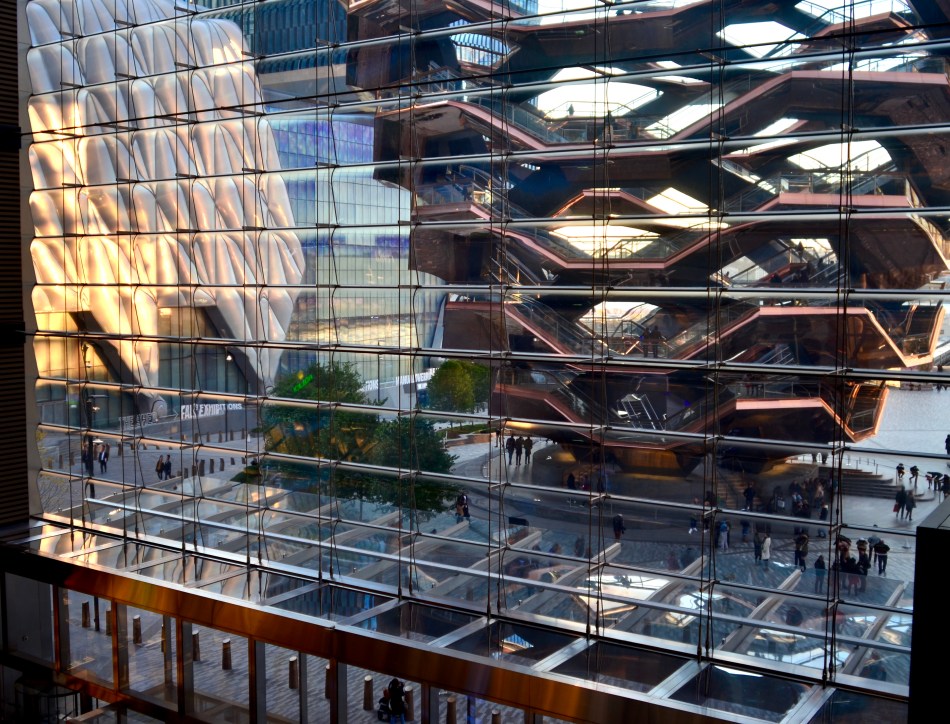 Vessel sits near the periphery of the High Line, the internationally praised West Side reclamation of the New York Central Railway’s old raised infrastructure, which now welcomes millions of strolling visitors and locals each year along its 1.45 miles of twisty, landscaped boardwalks, and has acted as the launch pad for recovery of the entire area, including Hudson Yards’ forest of skyscrapers and high-end shops. The first phase of the Yards is crowned by a glistening five-story mall whose massive glass facing wall is directly opposite Vessel. On the day when I visited, the free timed daily tickets to the inside of the honeycomb were all gone, so viewing it in the regular fashion was off the table. However, every floor of the mall has a spectacular view of the structure and its surrounding plaza, which actually appealed to me almost as much as a trip inside. The combination of reflection, refraction, and the golden glow of the approaching sunset made for a slightly kaleidoscopic effect, and so I decided to re-configure my plans. As mentioned before, the utter newness of the tower plays superbly well into photographic experimentation, as its design seems to present a completely different experience to the viewer every few feet, a very democratic sensation that rewards every visitor in a distinctly personal way. Besides, part of the fun of seeing new things in New York is weighing the hoorays and howls against each other and then making up your own mind.