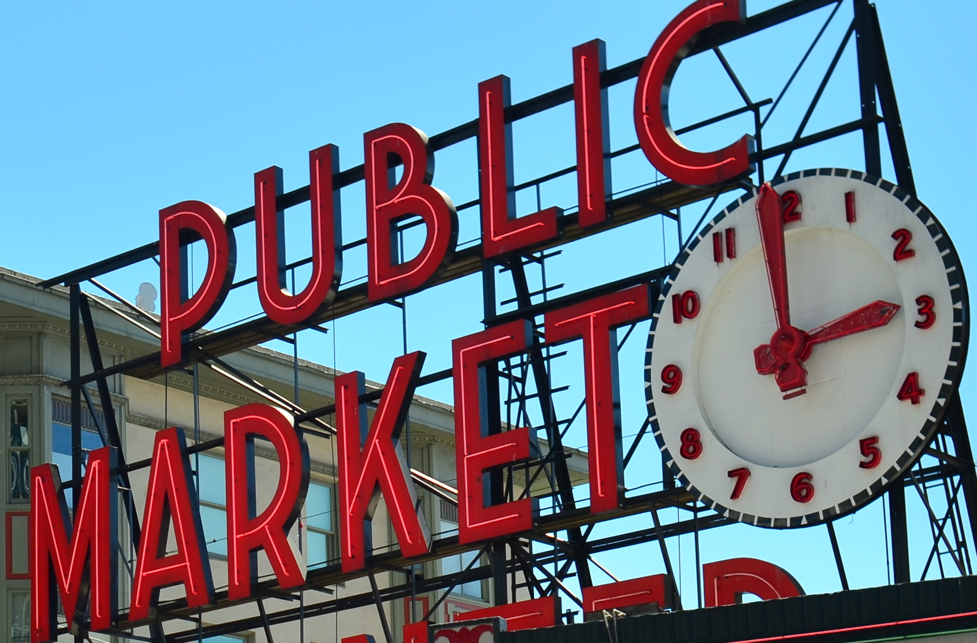 As seen at the top of the page, the sign for Seattle’s famed Public Market is often photographed as if it were the market itself, filling the frame of many photos with just its giant red neon letters. In reality, it is a small component in a vital, bustling neighborhood filled with rich visuals. Why not merely suggest the sign as part of a larger tapestry? More importantly, what is your vision?