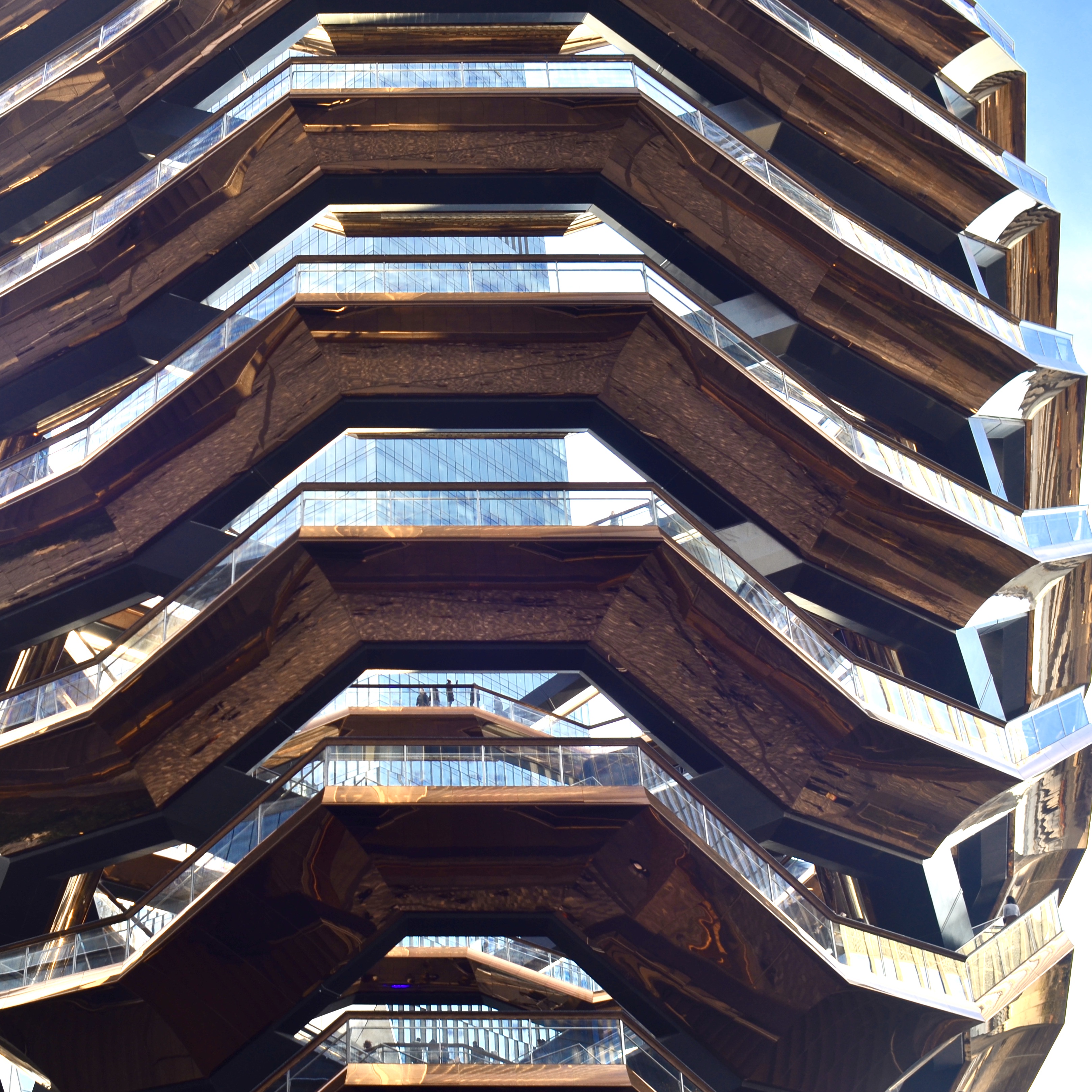IT HAS BEEN CALLED “THE EIFFEL TOWER OF AMERICA”, a “stairway to nowhere”, a “bold addition to the city’s landscape” and “an eyesore”,…….in other words, a new structure in New York City. Whatever its eventual place in the hearts of Manhattanites, architect Thomas Heatherwick’s Vessel, a hollow, honeycombed tower of open staircases, viewing landings and dizzying geometry, all sixteen stories of it, has become the visual exclamation point for the continuing explosion of shops and businesses known as Hudson Yards, a project so huge it may not max out for another decade. At this writing, it’s late 2019, and the tower’s creators, who claim the name “vessel” is just a transitional one, have already weathered a short tsunami of plaudits and protests since the beehive’s opening earlier in the spring. And in a city defined by bold visual signatures, the structure seems destined to become a darling for photographers, especially at its current newborn phase, in which there is, as yet, no “official” way of viewing it, no established postcard depiction to inhibit or limit individual visions. It’s at this first phase in a landmark’s life that all captures are equal: it’s the photographic equivalent of the Wild West.