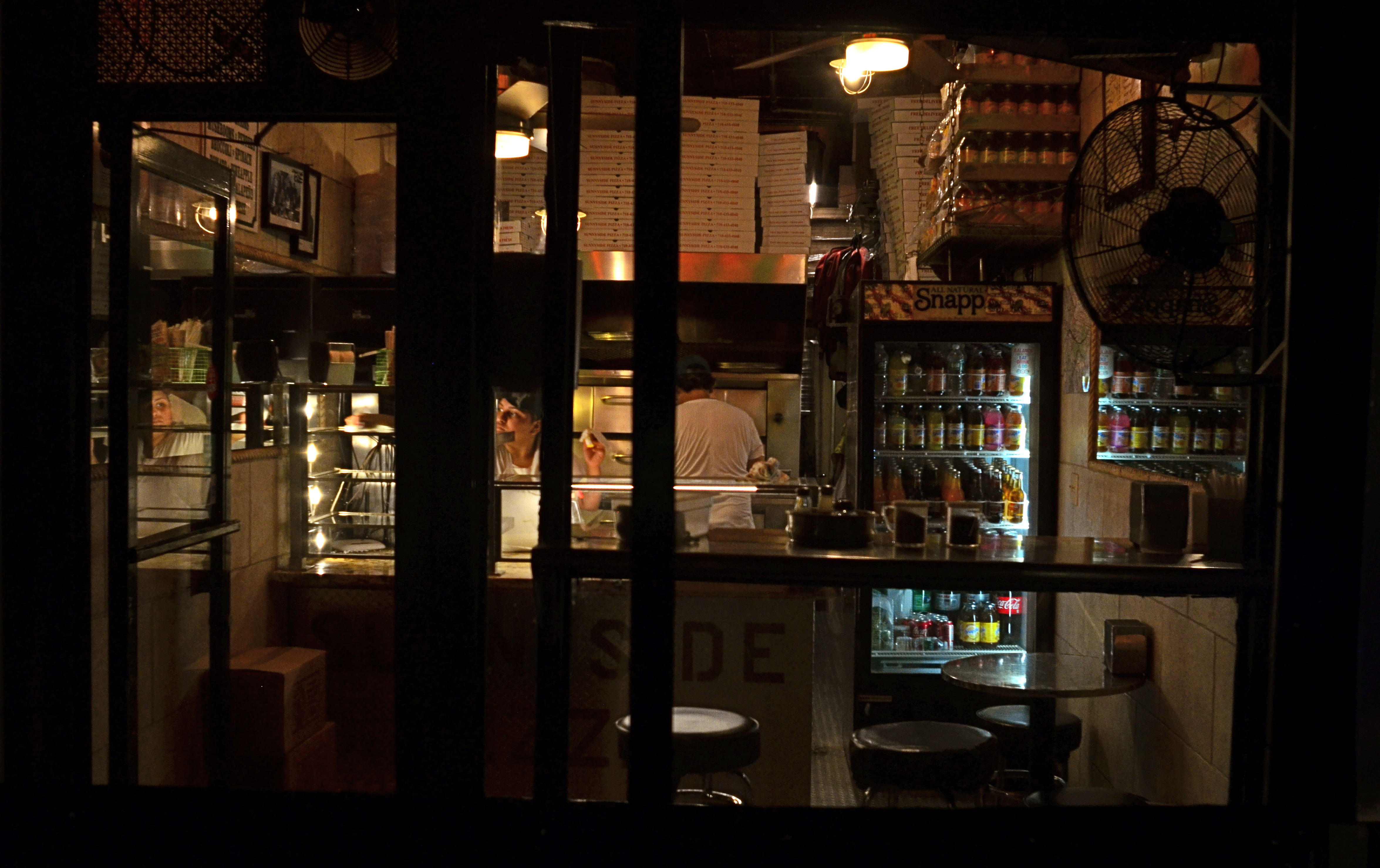 In fact, many photographic subjects actually present themselves in a kind of broken pattern right out of the gate, challenging us to create images from the spotty data they let through. For example, views through partially blocked windows, such as the one at the top of this page, in which what remains readable behind the darkened door and window framings, is more than enough to sell the message pizza shoppe.