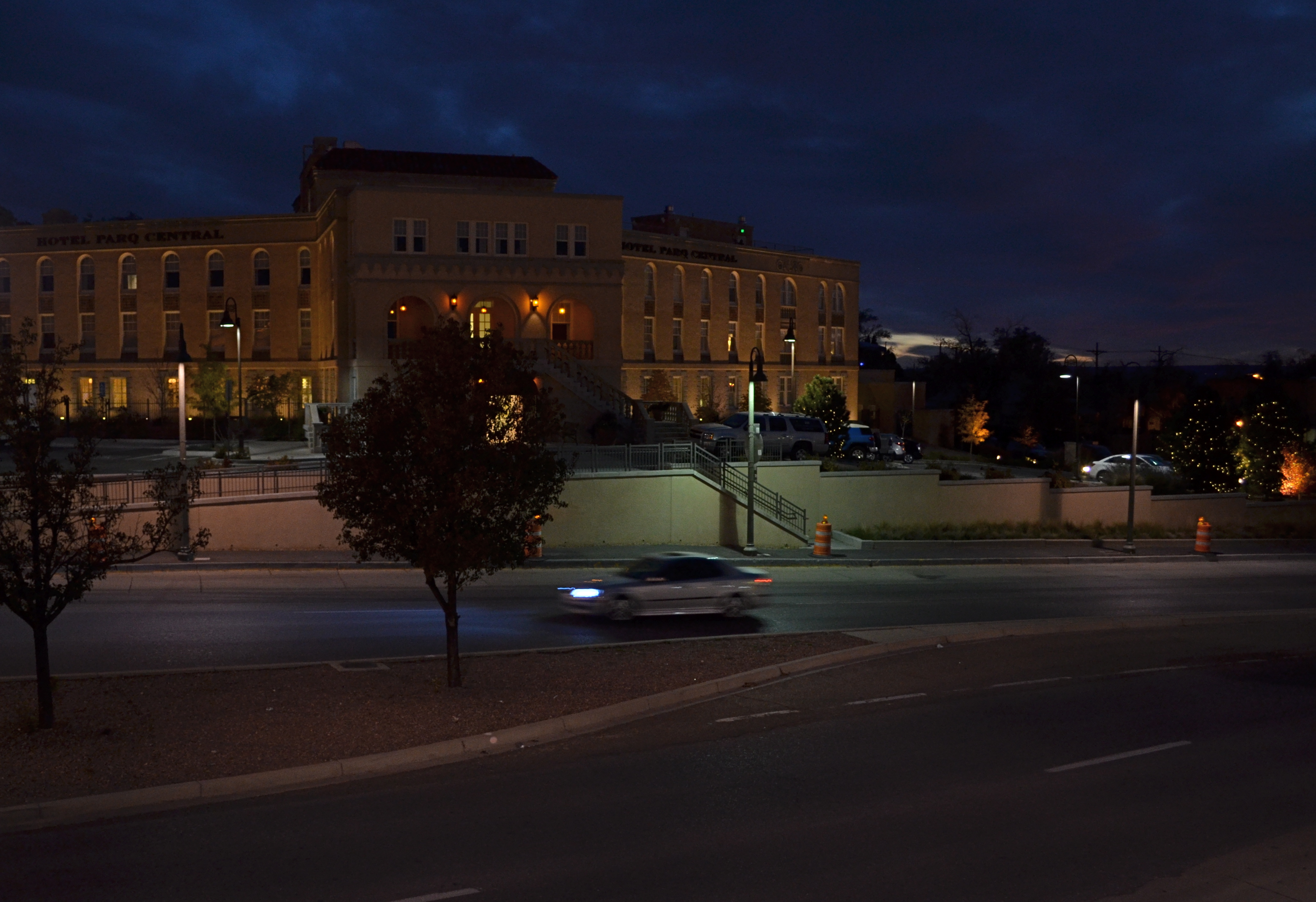 So, as to the image up top: in recent years, I have pulled away from the lifelong habit of making time exposures on a tripod, given the progressively better light-gathering range of newer digital sensors, not to mention the convenience of not having to haul around extra hardware. Spotting this building just after dusk outside my hotel the other night, however, I decided I had the time and vantage point to take a long enough exposure to illuminate the building fully and capture some light trails from the passing traffic.